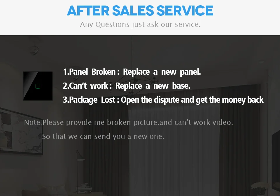 4. для первого сенсорного теста без стеклянной панели, пожалуйста, отключите питание после первого теста, затем закрепите сенсорный выключатель и защитную стеклянную панель, снова включите, и управляйте сенсорной панелью через 5 секунд
