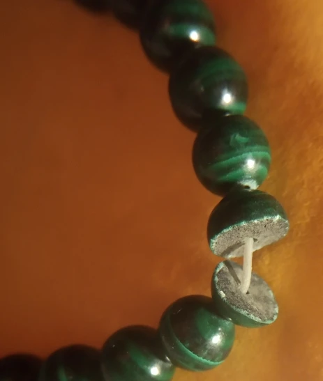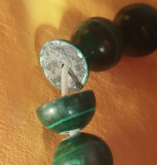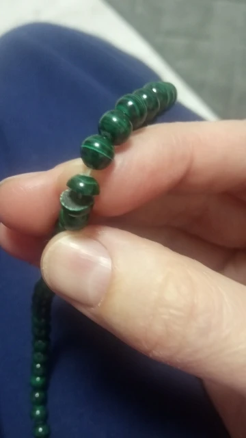 Одна из бусин была сломана. Внутри оказался серый мелкозернистый материал. На фото видны слои краски. Сначала слой белого цвета, затем зелёный цвет с разводами, чтобы было похоже на малахит. Я спросила продавца, что это. В ответ он уверяет, что это натуральный камень и прислал фотографию сертификата. Но от этого цемент не превратится в малахит. Все кто доволен покупкой, вы разламывали бусину? Внутри должен быть зелёный цвет. Или отзывы поддельные?