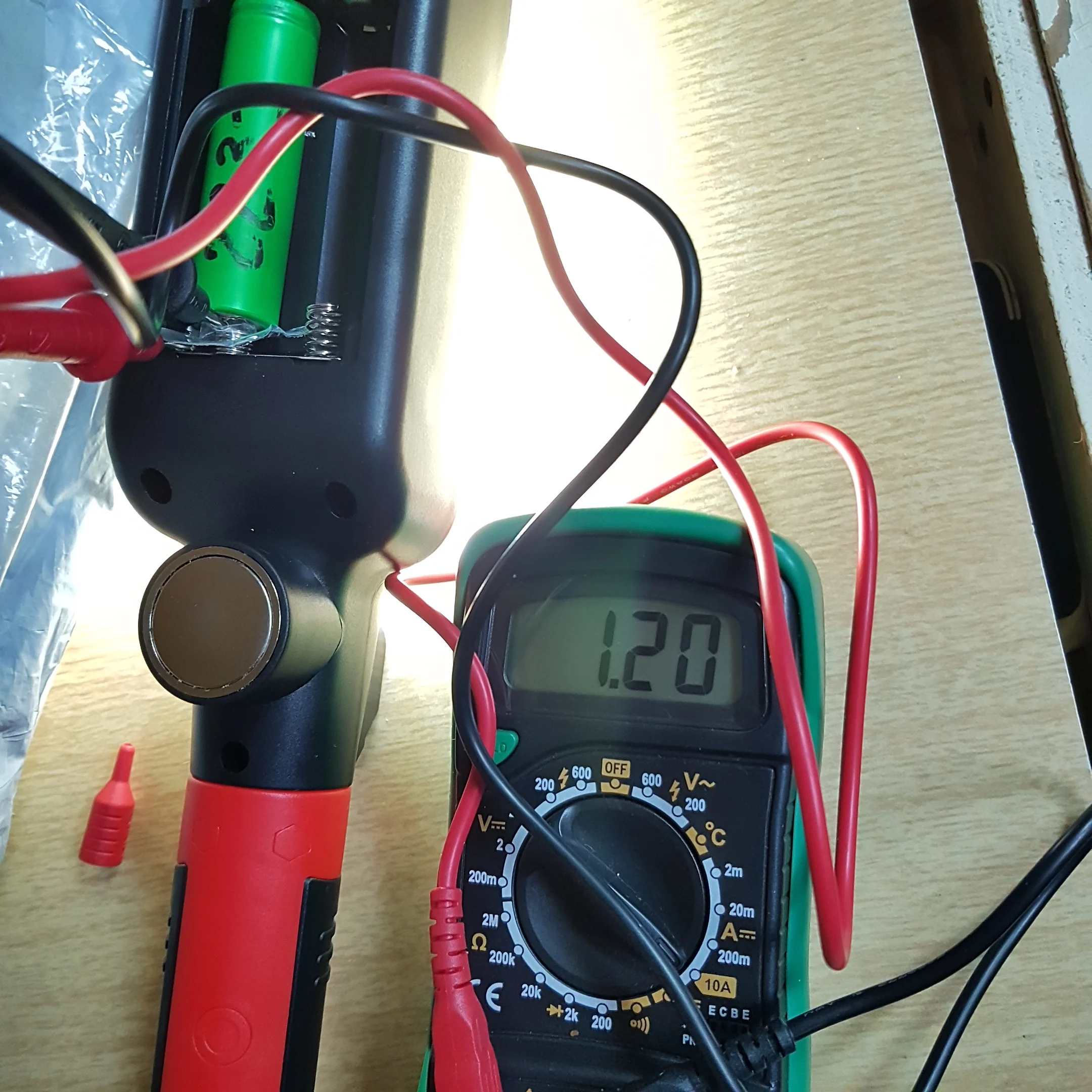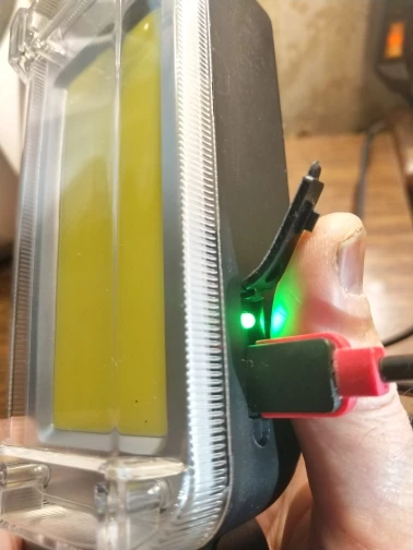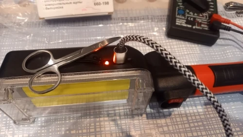 Фонарик специально брал для ближнего, но очень яркого освещения. COB-световая панель лучшее решение для этого. Равномерным светом заливает метров на пять - это лучше решение для любой деятельности, чем все долбанные дальнобойные фонарики светящие в одну точку световой сферой малого диаметра. Этот фонарик положил или повесил и всё на 180 градусов видно причём везде одинаково. Аккумуляторы вставил от ноута. У них осталось по 1700mAh, то есть в сумме будет 3400mAh. Измеряя потребляемый ток выяснил, что на первой позиции фонарик потребляет 0,6 ампера, а на второй позиции 1,2 ампера. То есть делим ёмкость 3,4Ah на 1,2А получаем 2,83 часа работы - это примерно 2 часа 50 минут. В выключенном состоянии утечек ток нет. При зарядке горит красный, по окончании зелёный. Отсечки заряда и разряда пока не проверял, а нужно, так как от этого зависит живучесть акумов. Светит также и от одного акума и даже от сети без них, но не сильно ярко.