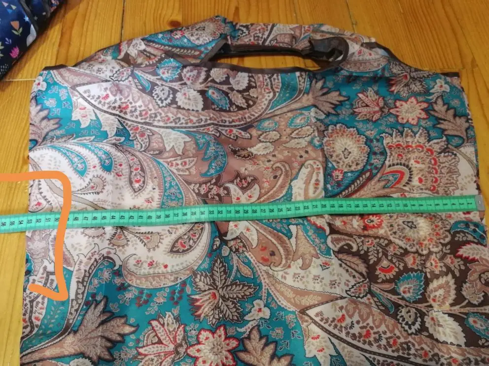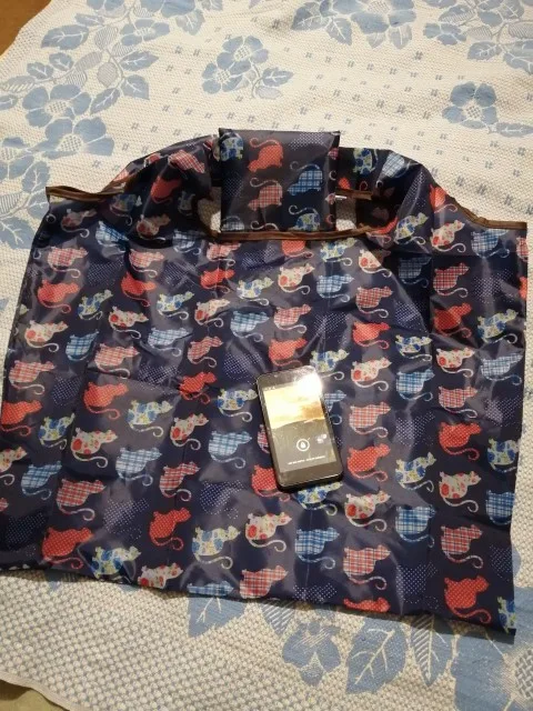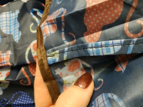 Сумка достаточно большая - по крайней мере больше, чем аналоги, купленные где-то в Европе. Швы аккуратные, ткань веселая, в собачках. Складывается в очень аккуратный и плоский конвертик. Буду смотреть, как поведёт себя в эксплуатации.
