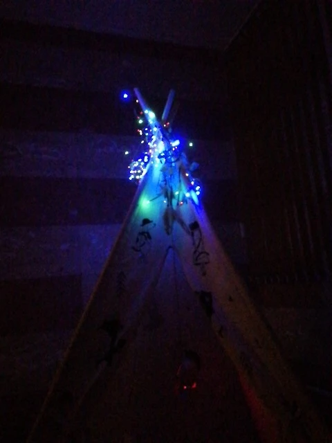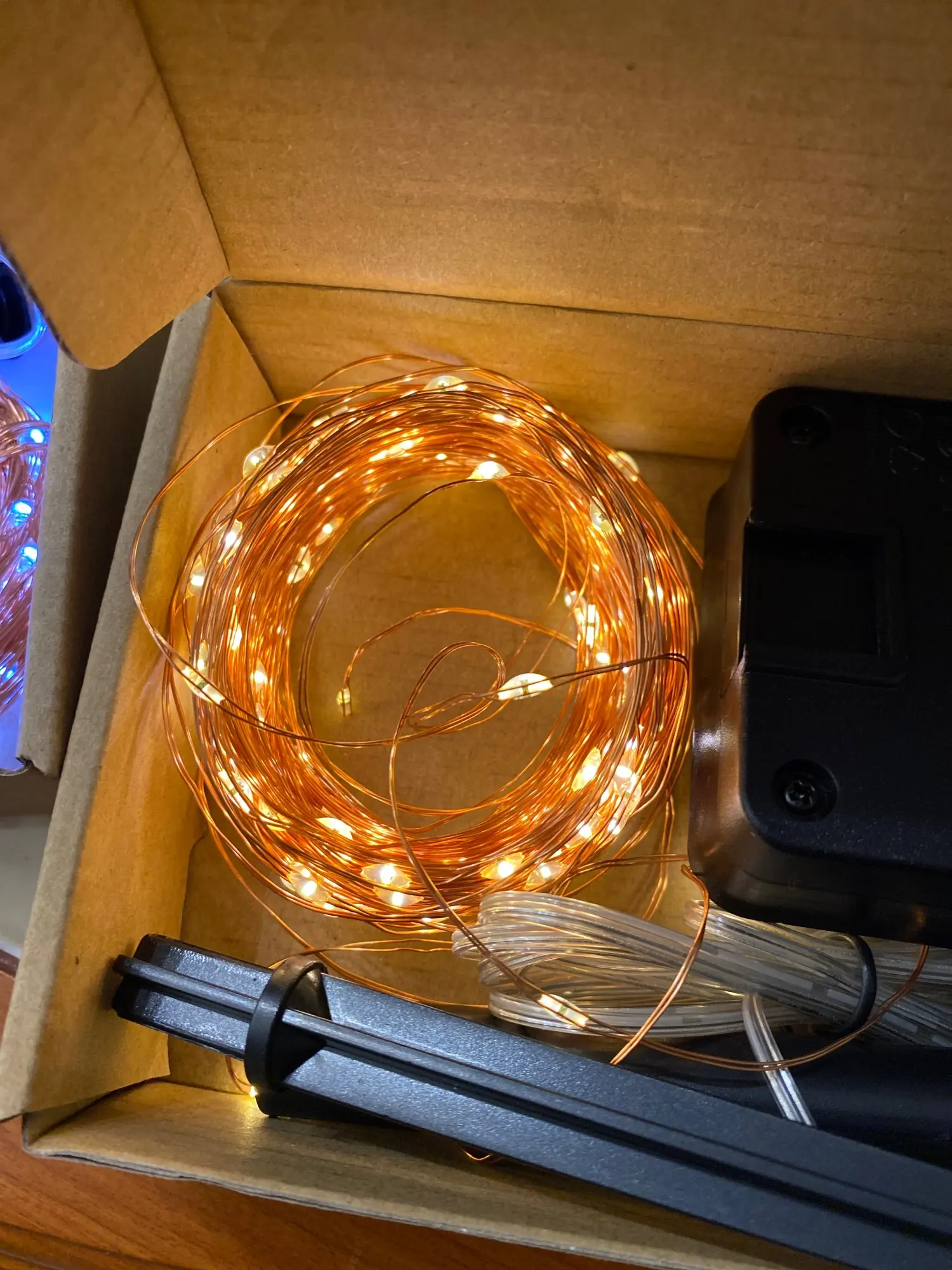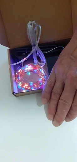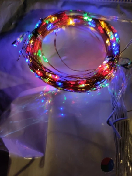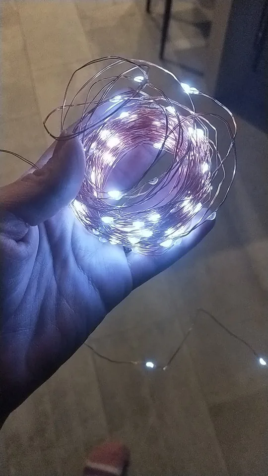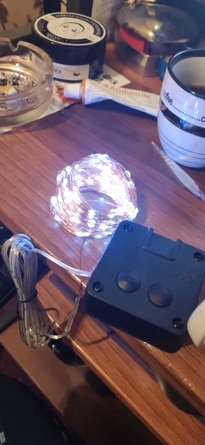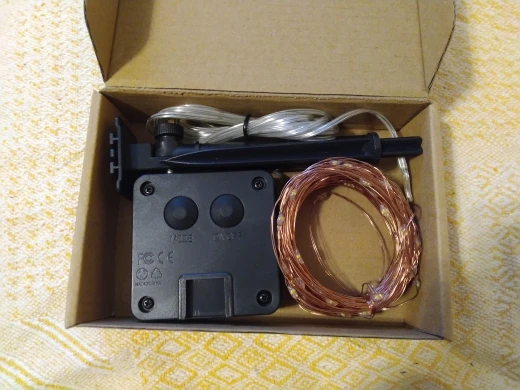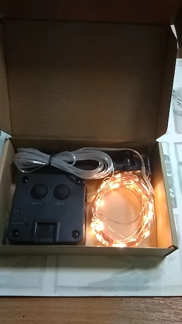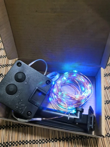 Гирляндочка оказалась совсем маленькая - крошечные светодиоды на тонкой медной проволочке. Как это использовать, чтобы не запутать, непонятно. Но работает.