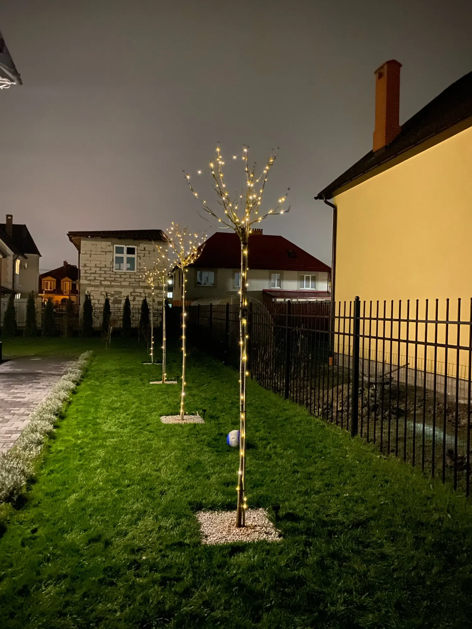 Заказала гирлянды 11 ноября, 26 ноября получила в постамате халва в Калиниграде. Сегодня украсила штамбовые деревья в саду. Батареи были заряжены, пока все горит. Смотрится отлично. Жалею только, что взяла по 12 метров. Нужно было брать 20тиметровые, чтоб ещё гуще и ярче. Но, пока крона у деревьев небольшая, тоже хорошо.