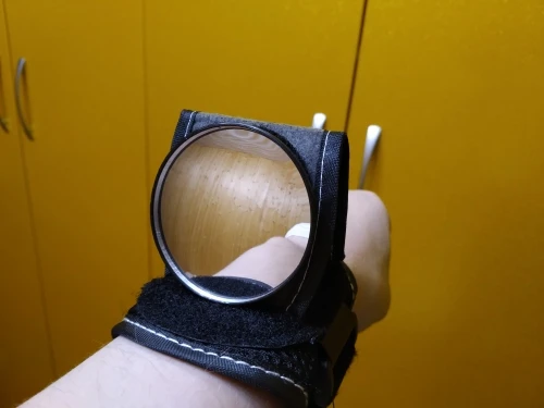 Ремешок короткий, поэтому на зимнюю куртку не одеть. Для езды на самокате самое оно, но с обзором не всё так хорошо, как может показаться. Основная проблема в том, что локоть и плечо закрывают обзор. Ещё в страйкболе это была бы прикольная штука.