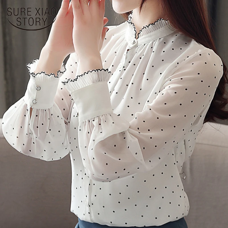 Модная женская блузка 2019 женская блузка с длинными Весенняя рукавами и воротником-стойкой шифоновая в горошек с пышными рукавами рубашка 2261 50