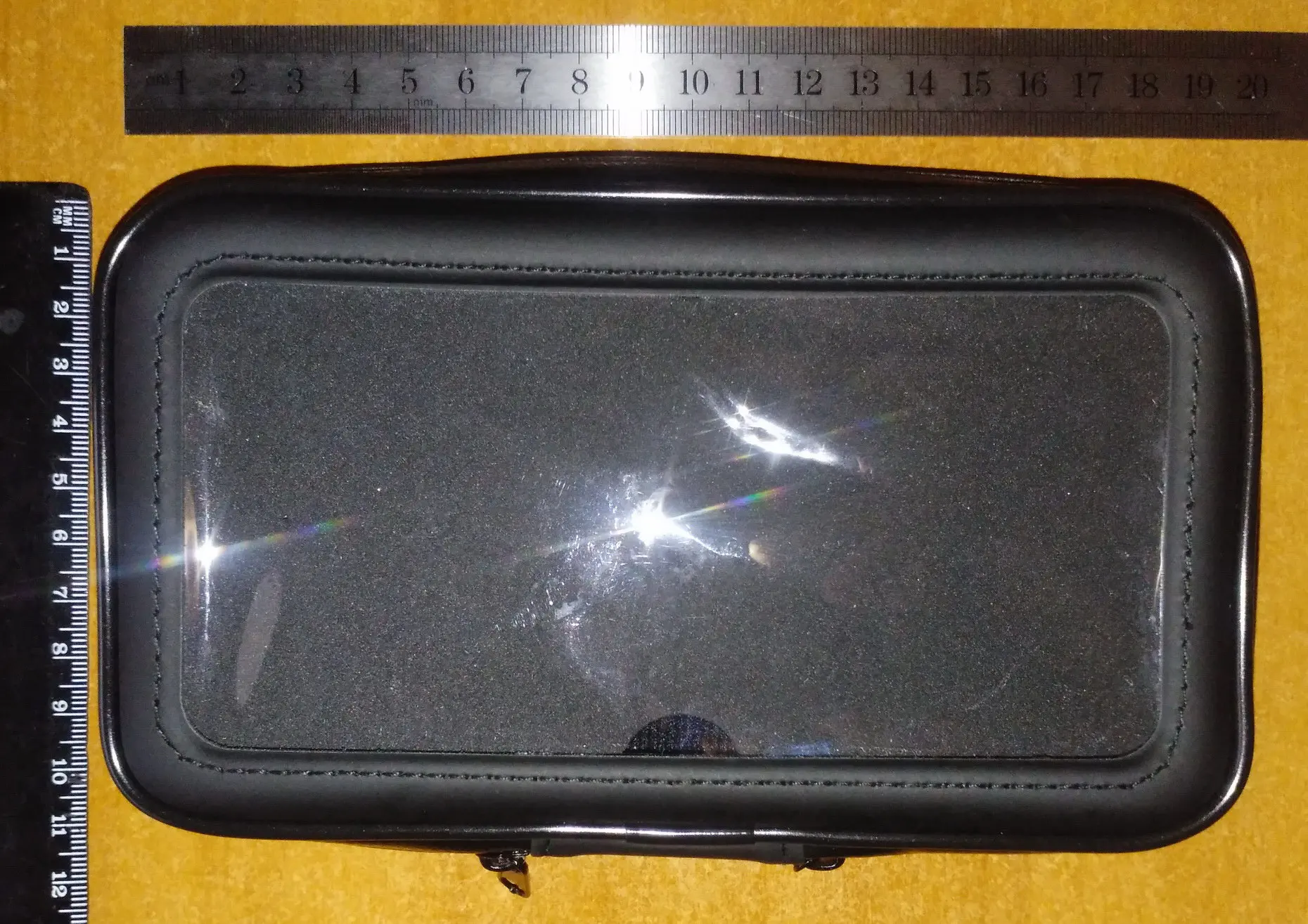 Доставка около месяца. Трек отслеживался. Держатель футляра пластиковый. Футляр крепится к нему очень туго, с защелкиванием. Пришлось даже немного подточить выступы надфилем, иначе не вставлялось. Сам футляр прошит хорошо, молния герметичная. Единственный недостаток - неровная прозрачная плёнка футляра, немного помятая. Волнами плохо прилегает к экрану. Покупал размер XL. Размер прозрачного окна 72x150 мм.