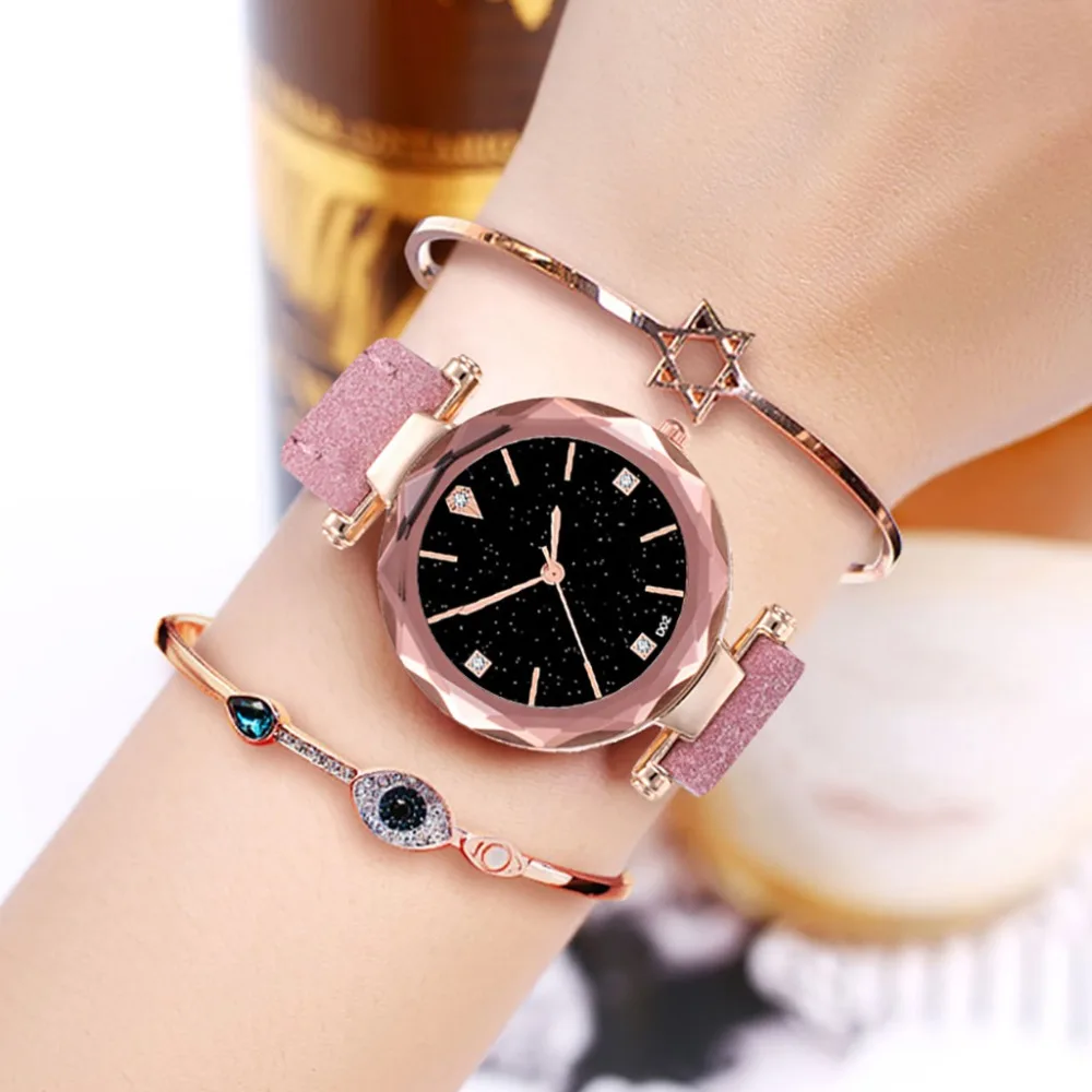 Модные женские часы со стразами, розовые женские кварцевые наручные часы с циферблатом звездного неба и кожаным ремешком, женские часы 2019 стразы, женские часы