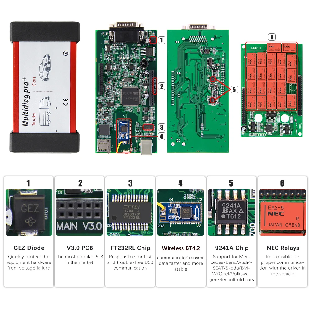1. Диод GEZ: защитная функция с очень быстрым временем отклика, которая может предотвратить скачки напряжения, которые могут повредить электронное оборудование Устройства2.V3.0 PCB: самая популярная PCB3. Чип FT232RL: отвечает за быструю и беспроблемную связь через USB4. Беспроводной модуль: стабильная и быстрая Беспроводная связь5. Двойной чип 9241A: поддержка Mercedes-Benz/Audi/SEAT/Skoda/BMW/Opel/Volkswagen/Renault6. Оригинальное реле Japan NEC: отвечает за надлежащую связь с водителем в транспортном средстве