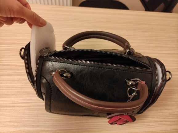 Сумочка была отлично предназначена как модель, но мастерство-очень грубая: торчащие нитки, много следов белого материала/клея или чего-то другого... Отделочные работы остались для покупателя... поэтому-меньше *. Также упаковка была очень плохой