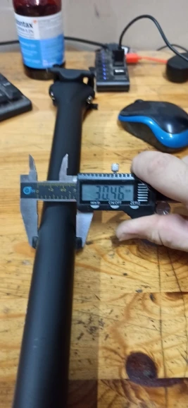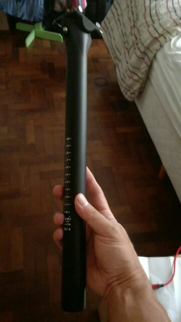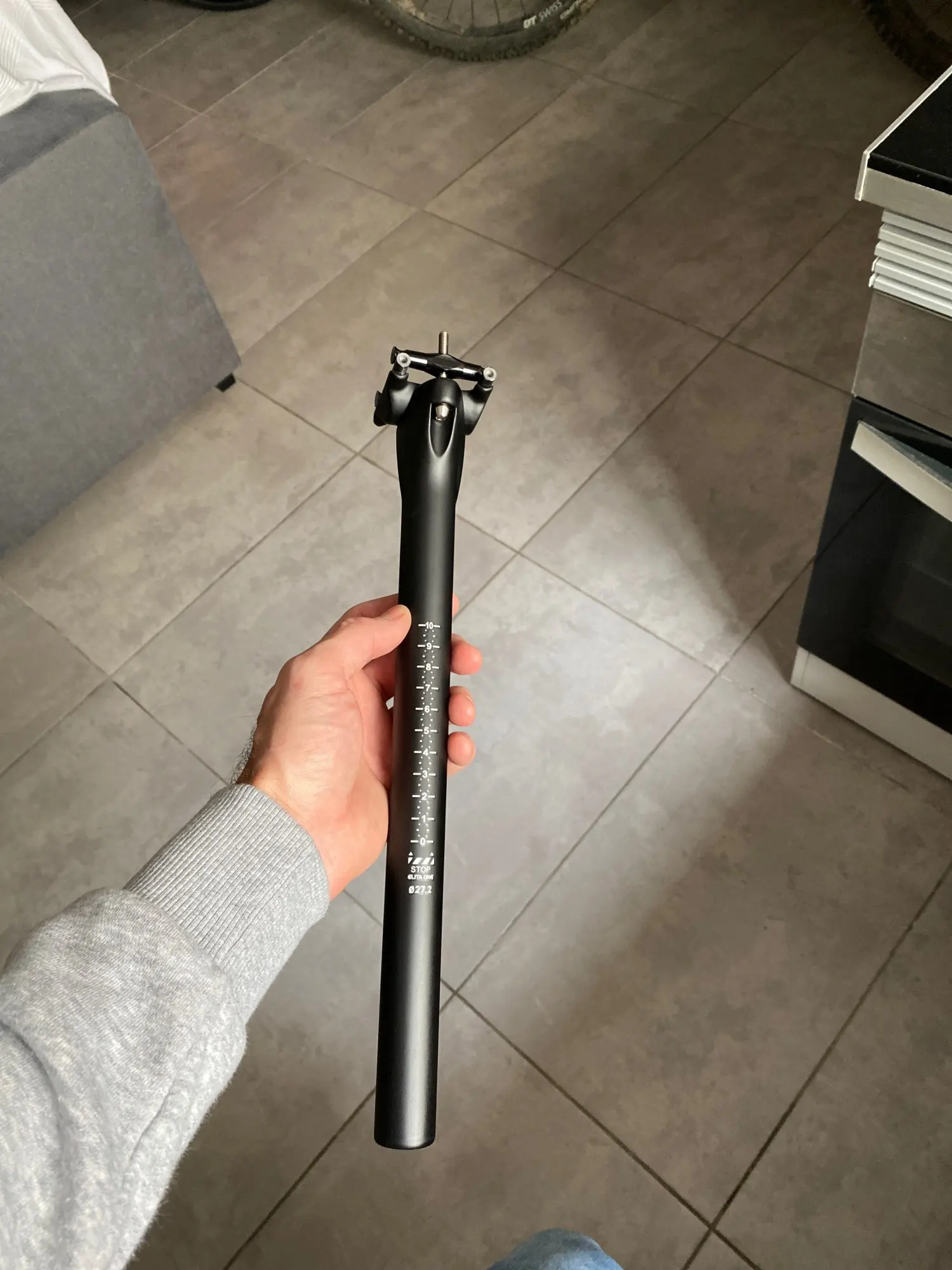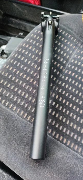 Пришел за 20 дней в не самой жесткой картонной коробке, пупырке и с трубочками в зажиме. Никаких бумажек. Масса версии 31,6*400 - 158 грамм. Внутри сама трубка сделана нормально, в глубине ближе в зажиму как всегда немного полиэтиленовой пленки и тряпок. Конечно, отделка не идеальна, это видно особенно на заглушке трубы сверху, в отверстиях под болты. Болты не магнитятся, как и бобышки, по резьбе идут хорошо, но если поменять местами - может быть туговато. Выставляются не идеально ровно при зажиме, но на рейлы попадают. Покрытие - как будто софт-тач пластик, очень приятное. Риски сзади нанесены не по центру, хотя и соосно, не криво. Мириться с косяками отделки или нет - решайте сами. Мне норм. Притом есть оригинальный Syncros, который весит 200 грамм, и посмотрите, насколько толще у него стенка! Увы, штанген ещё не заказал, толщину точно не скажу, но на глаз тут миллиметра два. Как себя поведет - пока не знаю, погода уже для меня не катабельна. Если сломается и я останусь жив - дополню
