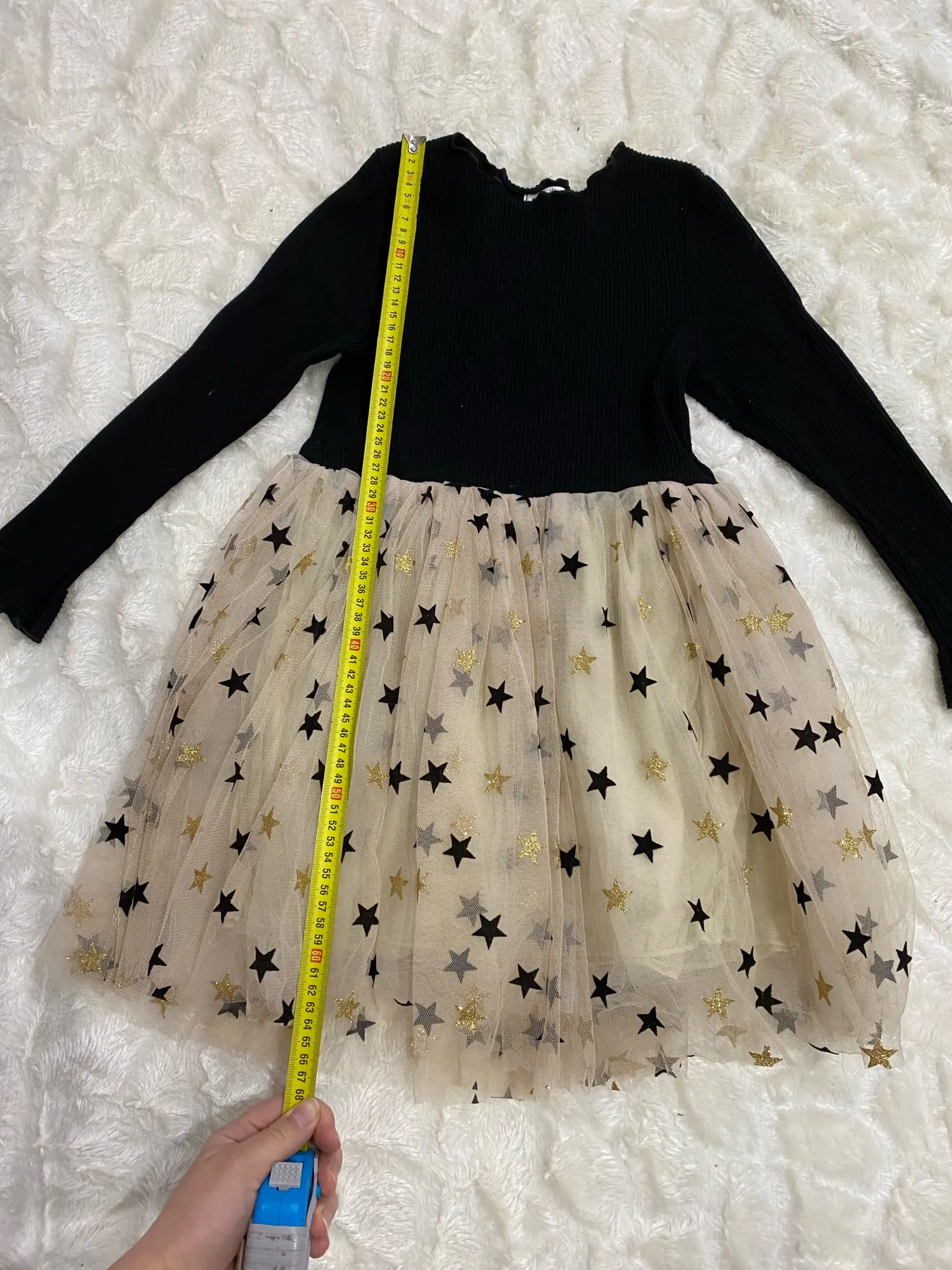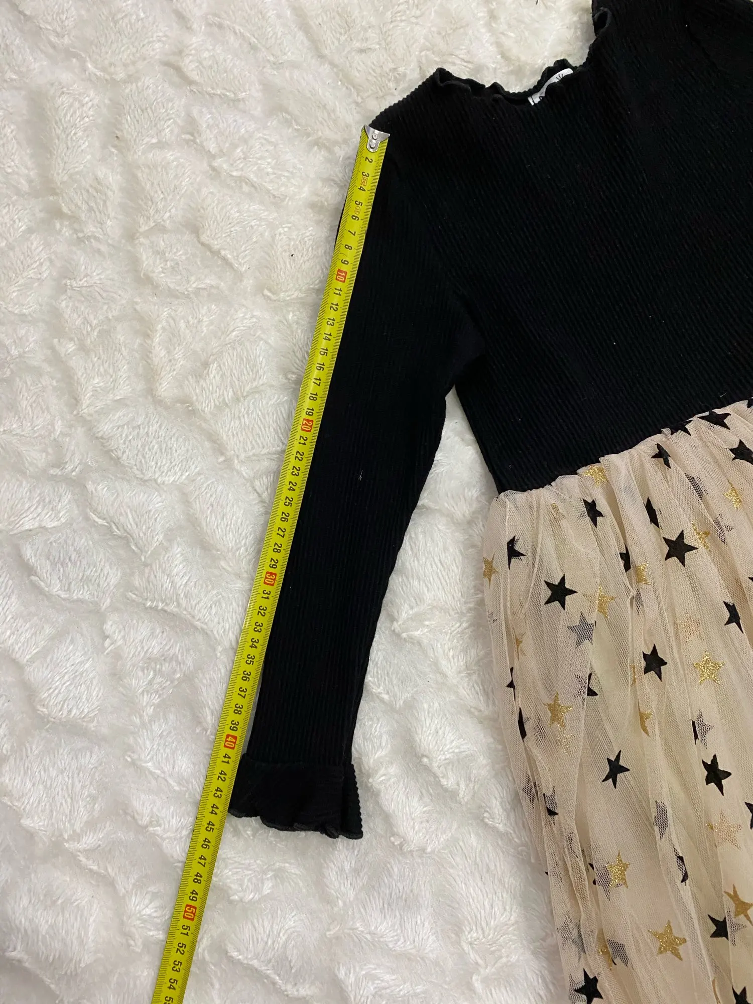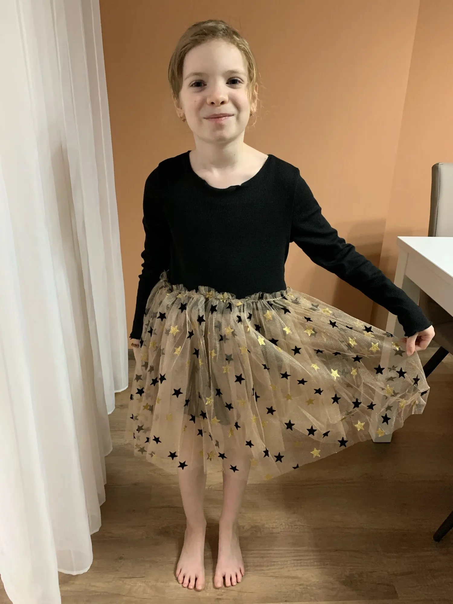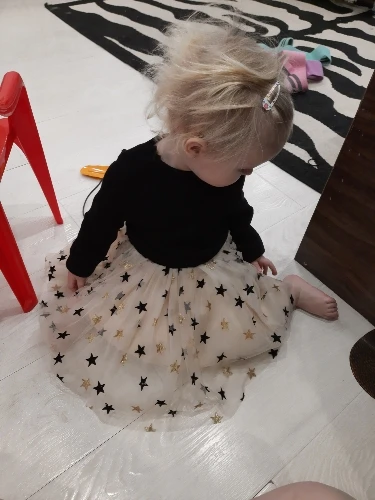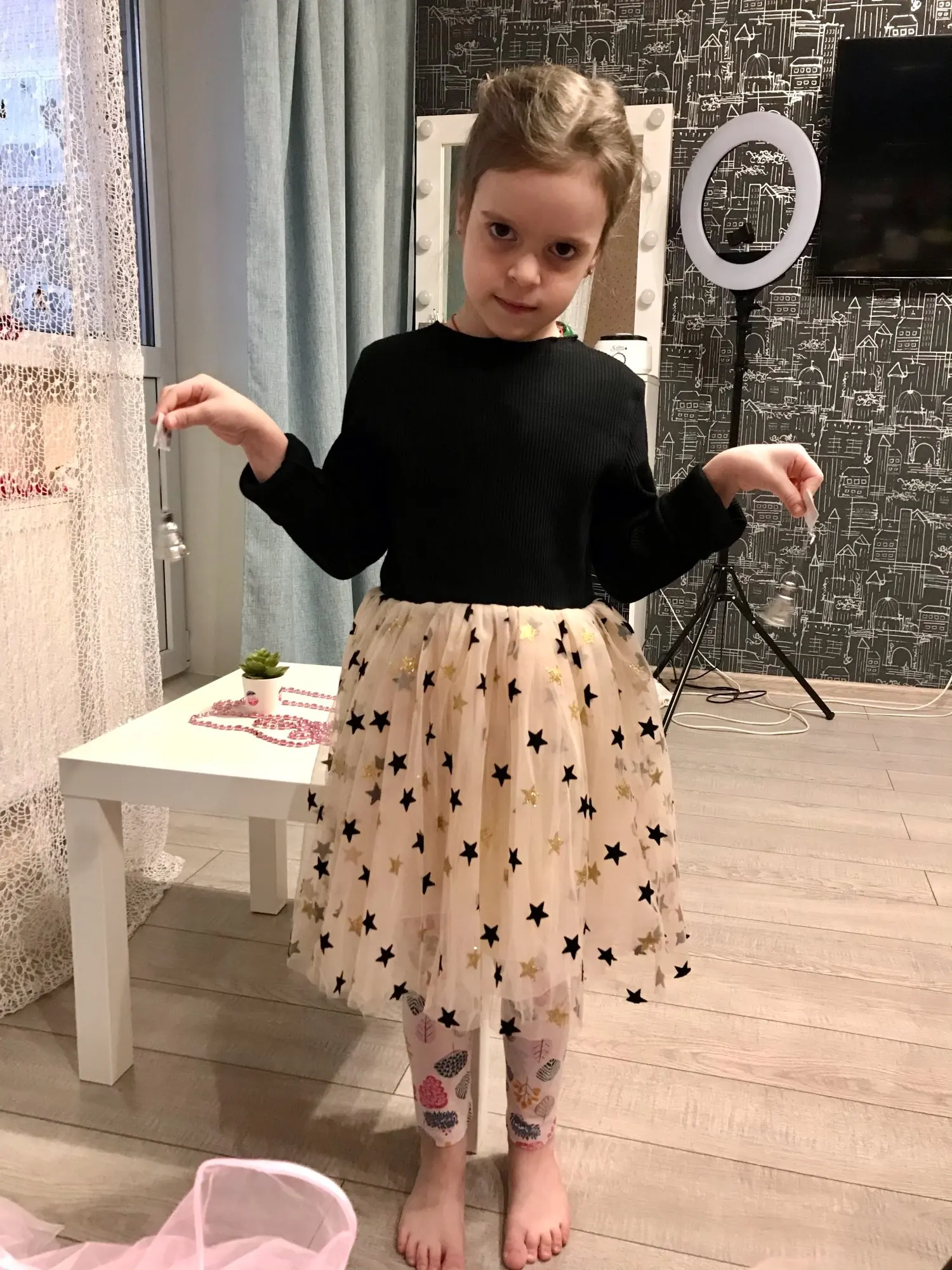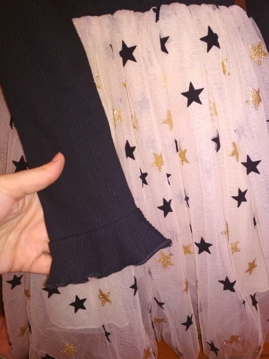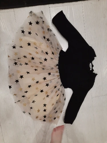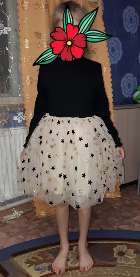 В разложенном виде очень красиво смотрится. Приятная ткань верха, пышная юбка, звёзды качественно пришиты и красивый поясок. Размер 3Т на девочку 3,5 как раз и даже с запасом. Но на ребёнке платье смотрится немного непропорционально, юбка начинается чуть ниже груди и топорщится, а поясок не удерживает форму. Фото не успела сделать. Дошлю