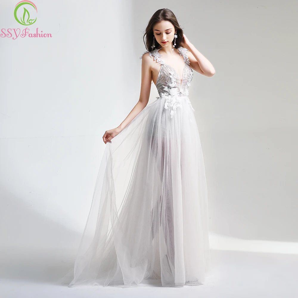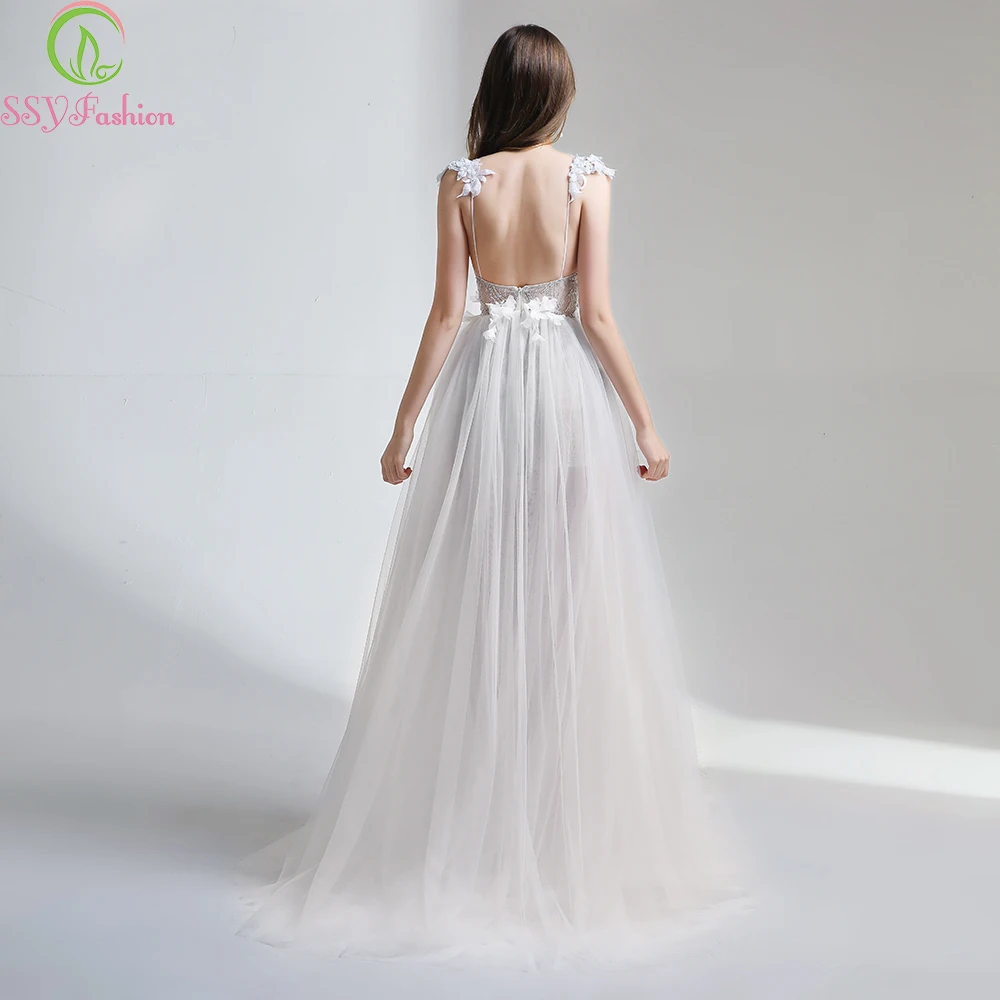 Женское вечернее платье SSYFashion, белое кружевное платье с V-образным вырезом и открытой спиной, с цветочным принтом, для банкетов и вечеринок, в наличии