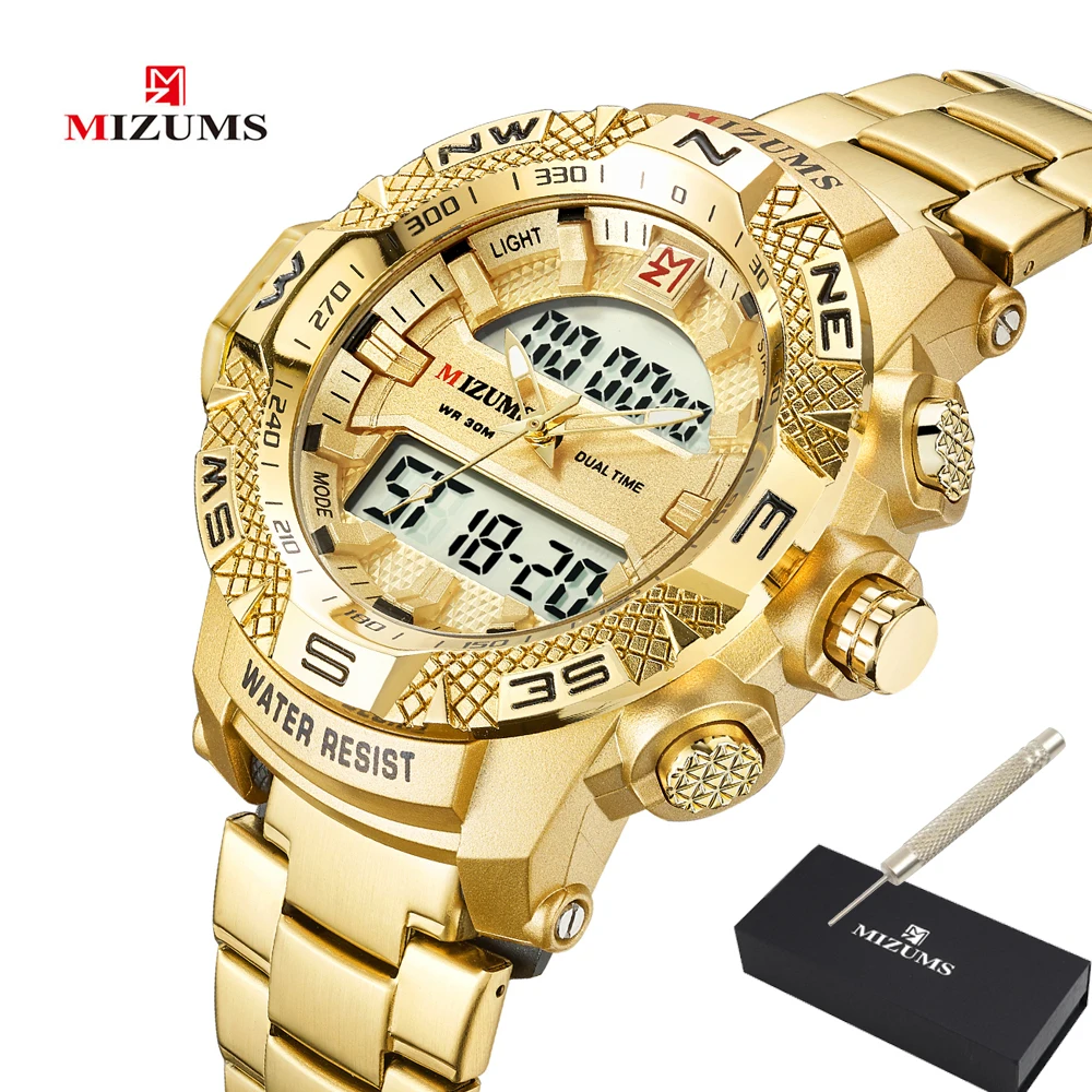 Золотые часы, мужские, светодиодный, цифровые спортивные часы, мужские, водонепроницаемые, нержавеющая сталь, ремешок, люксовый бренд Mizums, мужские кварцевые наручные часы XFCS