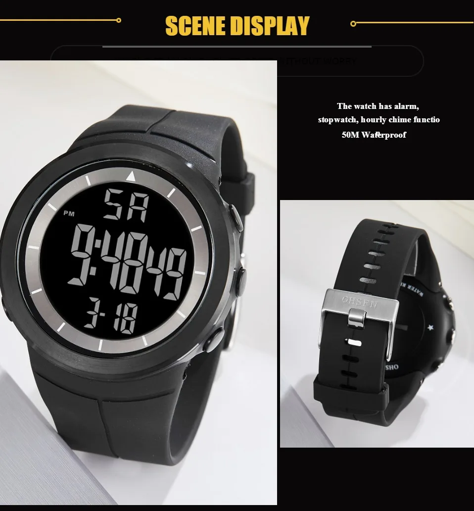Модные цифровые мужские наручные часы OHSEN с ЖК-дисплеем, водонепроницаемость 50 м, ударопрочные спортивные черные военные электронные мужские часы, мужские часы