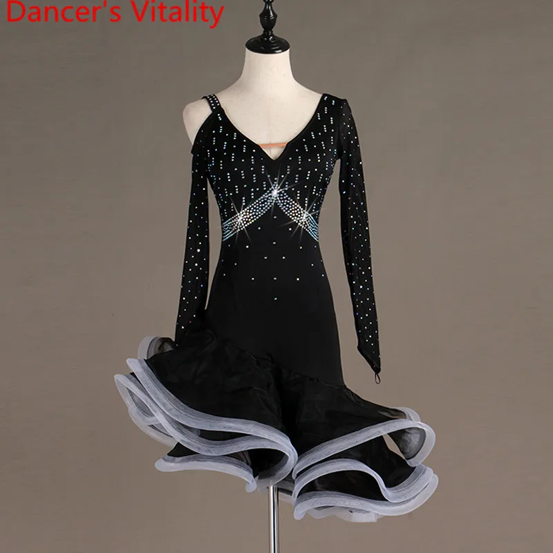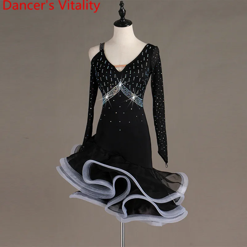 Женское платье для современных танцев для взрослых с длинными рукавами и бриллиантами, костюм для выступлений, танцевальная одежда для румбы, ча-самбы, сальсы