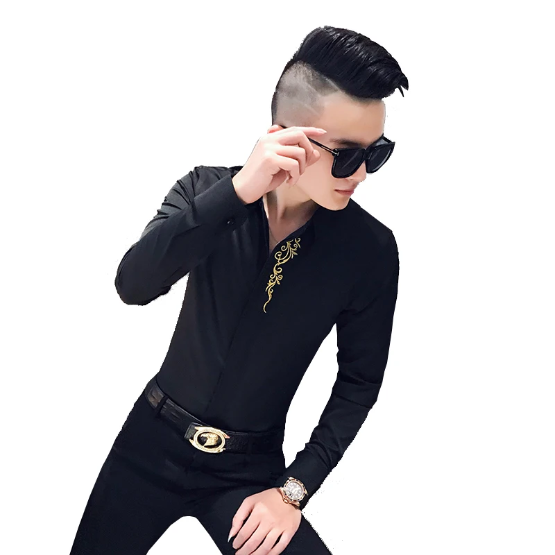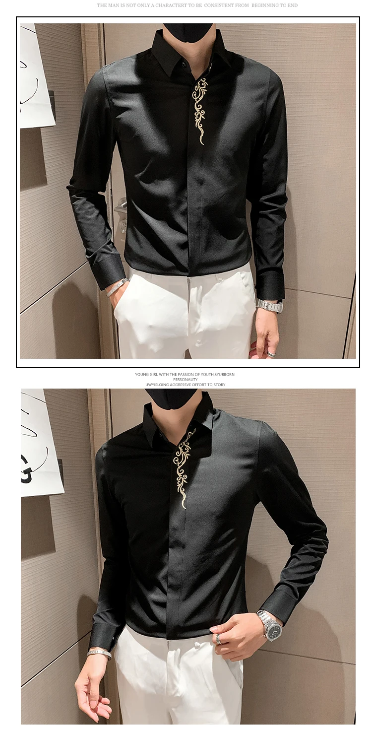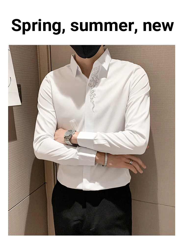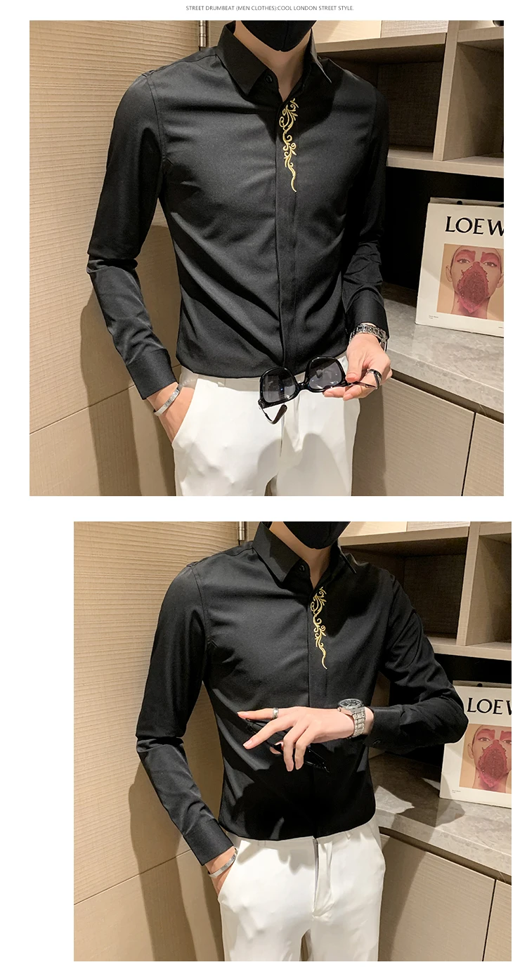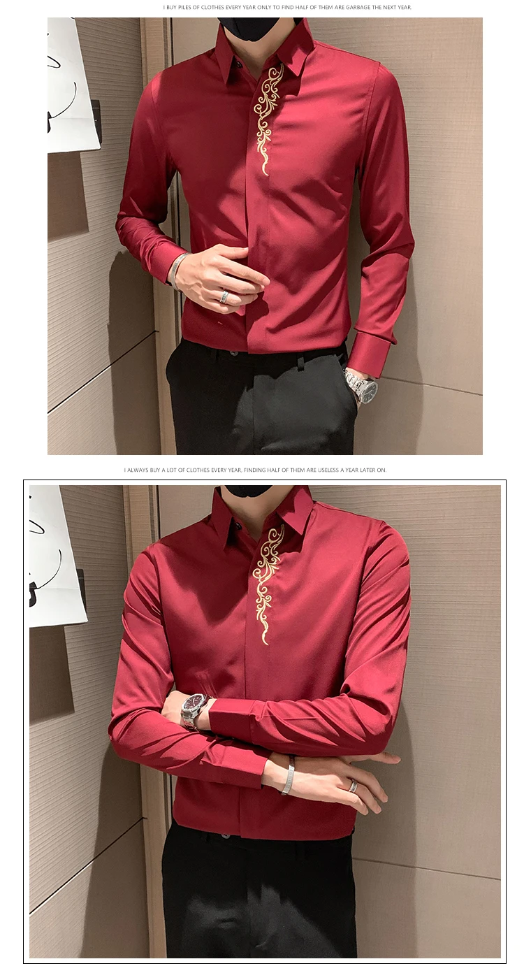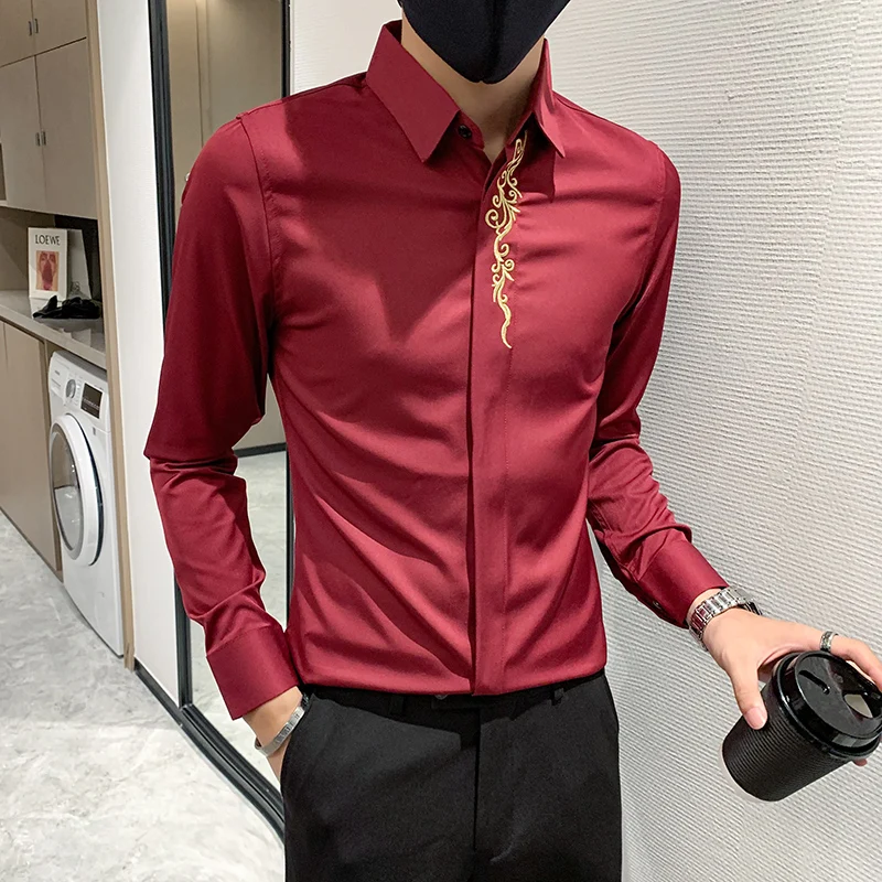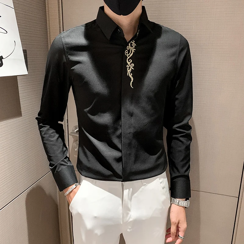 Рубашка мужская с вышивкой, однотонная, с длинным рукавом, в винтажном стиле