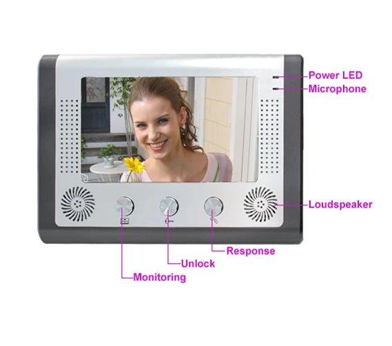 Особенности:Панель из алюминиевого сплава внутреннего блока, модная и роскошная.Небольшой дождь и устойчивость к окислению для прочного наружного блока из алюминиевого сплава.Цветной TFT ЖК-дисплей 7 дюймов без излучения, низкое энергопотребление и высокое разрешение.ИК-камера с ночным видением.Функция управления электрическим замком.Домофон громкой связи.Функция отключения внутренней связи.Наблюдение за внешней стороной двери.12 видов колец дверного звонка.Регулировка громкости, яркости и контрастности.