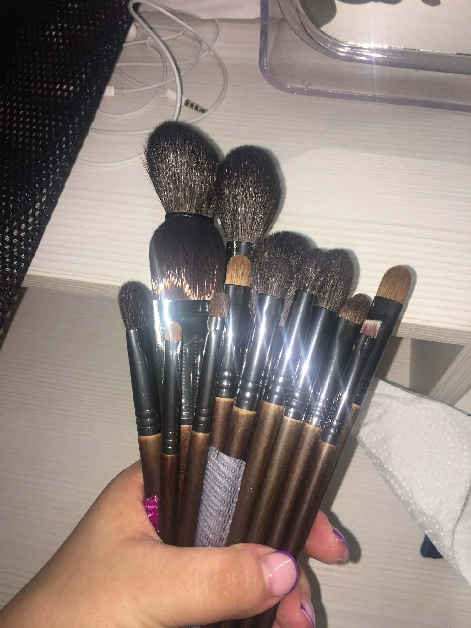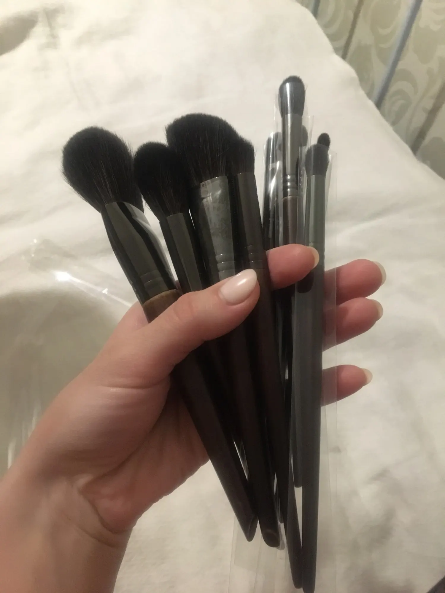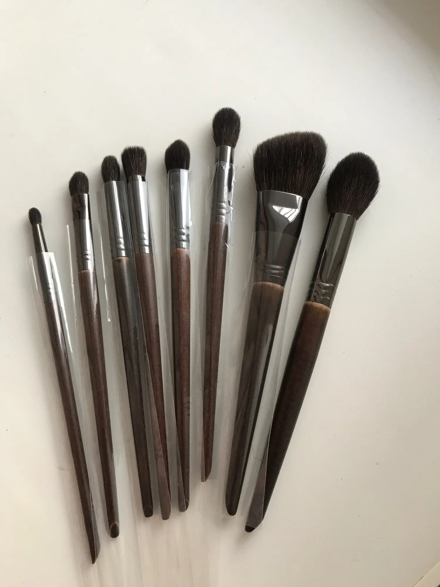 Заказала два набора, каждый по 7 кистей. Пришло достаточно быстро, принёс курьер. Сами кисти выглядят достойно, мягкие, очень приятные, одна из больших синтетическая-на фото она чёрная без блеска. Но я думаю, это не помешает. После мытья не облысели. Спасибо) Продавца рекомендую) в подарок положил щётки для ресничек, приятно)