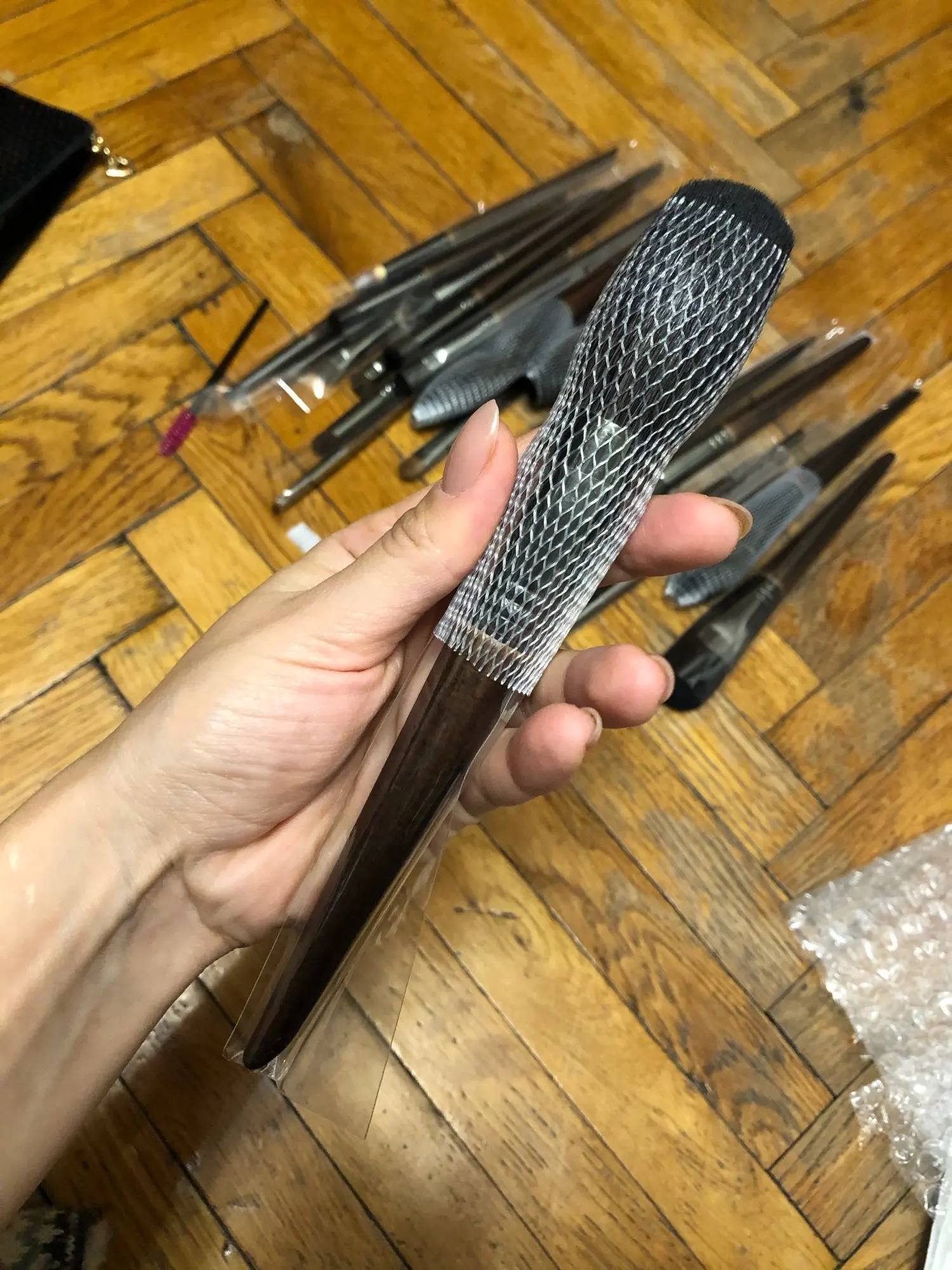 Получила в последний день доставки. Упакованы в пупырку. Большие кисти в сеточке. Запах немного был, но после мытья ушёл. Кисти очень мягкие, приятные, но в работе ещё не пробовала. Позже дополню отзыв. В подарок продавец отправил запасные скточки для сушки кистей)