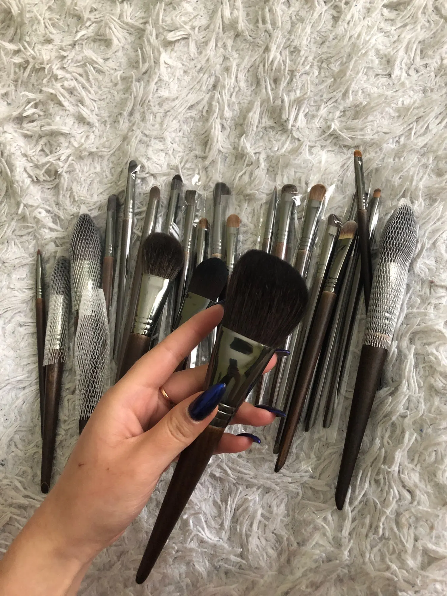 Шикарные кисти,натуральный ворс,мягкий и приятный к лицу.Единственное есть небольшой запах,но это не критично,с сухими текстурами на ура,точно передают пигментацию!