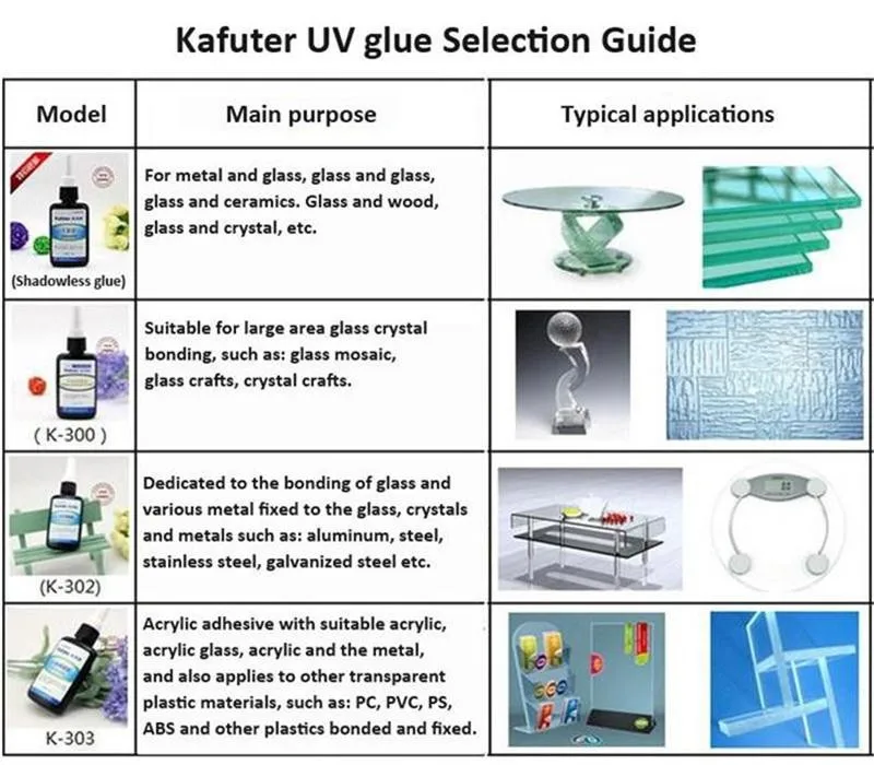 K-302 usagesThe bonding glass and various metals fixed, for glass, crystal and metals, such as: aluminum, carbon steel, Stainless steel, galvanized steel, etc. have a good bonding effect.