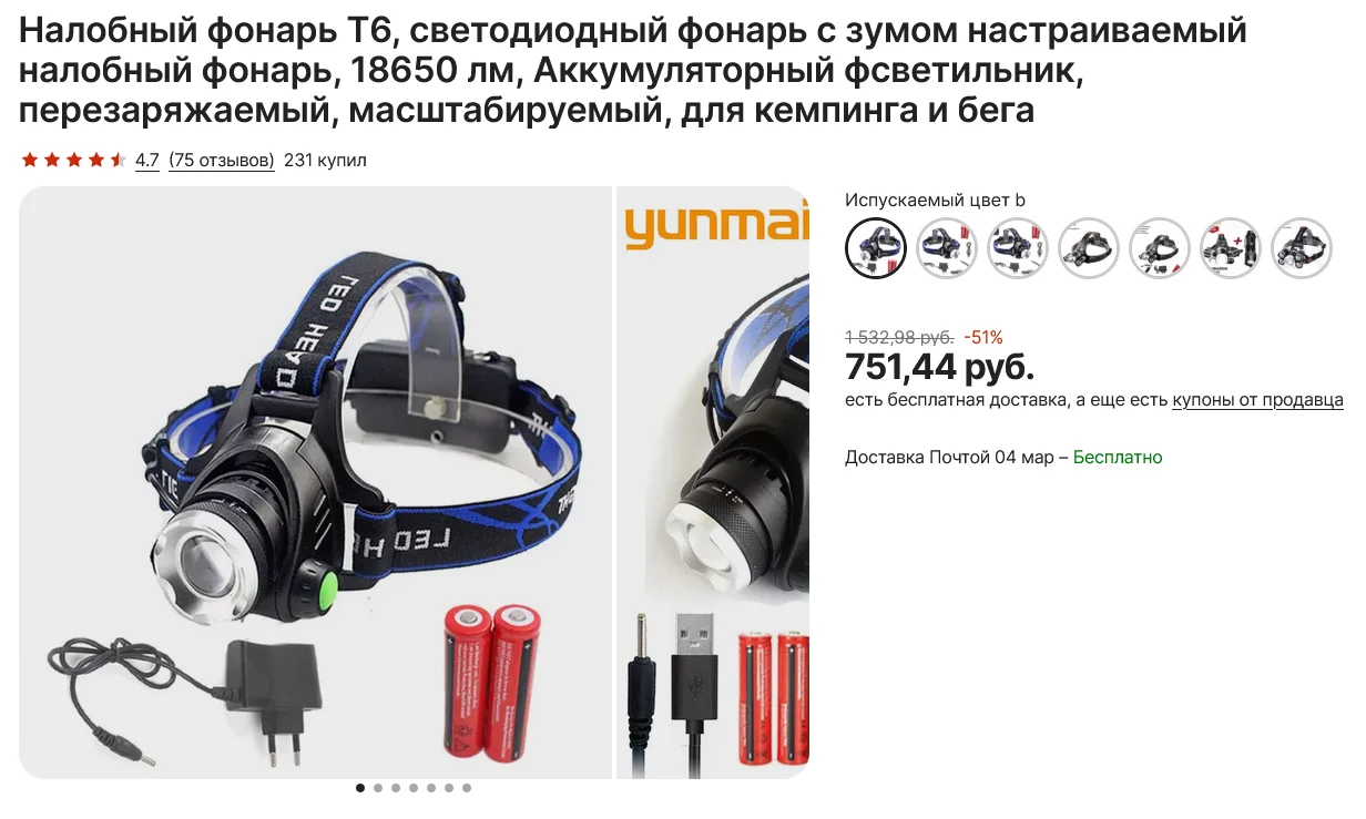 отличный копеечный фонарик. 3 режима - мощный, слабее и стробоскоп. на голове держится, на слабом режиме вполне можно делать какую либо работу в руках. за такие деньги даже грех на что то жаловаться )))