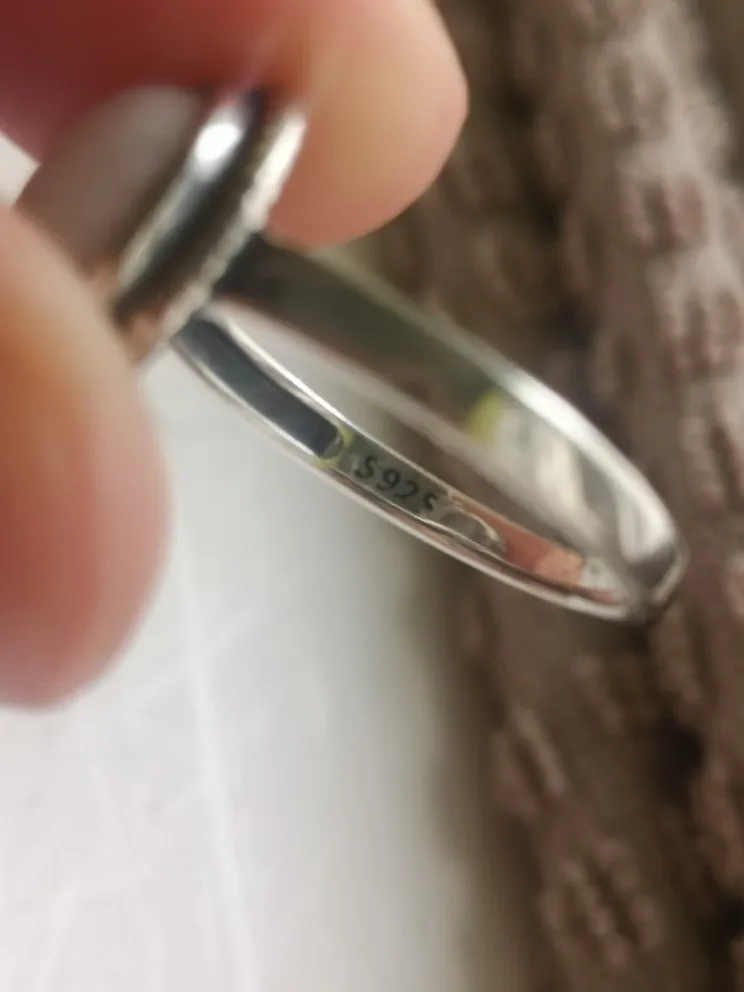 Он имеет отметку 9,25, выглядит как Настоящее серебро (прошел тест на магнит) очень мило. Камень более вытягивает белый, чем «лунный камень», но все равно отлично. Я ношу 12 в Европе и Размер 7 очень хорошо мне подходит. Это действительно мило. Рекомендовано.