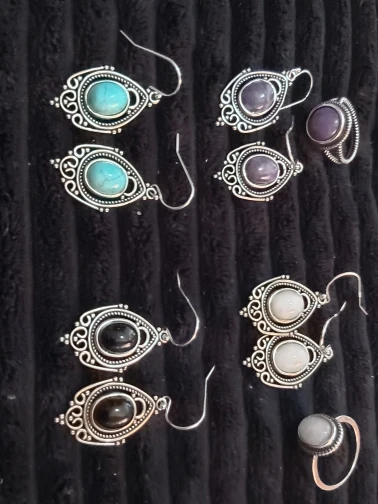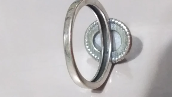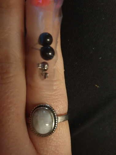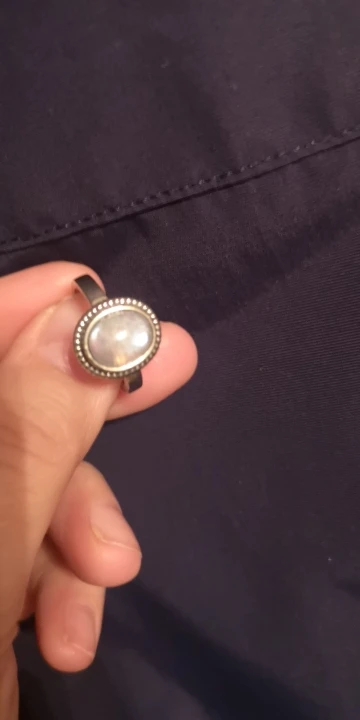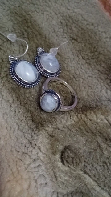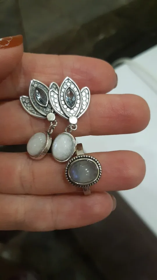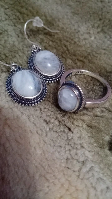The stone has a milky color with a colorless shine, and not blue like the photo, but it is still beautiful. The silver is actually real and of good quality (tested with make up). The size is accurate. Thank you, will purchase again.