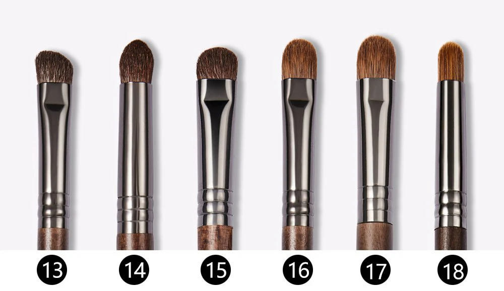13 Скошенная кисть для теней, 0,9 см/16,9 см14-точечный шейдер 1,3 см/17,4 см15 Кисть для нанесения и растушевки теней, 0,8 см/16,7 см16 Duo волоконный шейдер 1,2 см/17,2 см17 Кисть для нанесения теней, 1,4 см/17,3 см18 точный блендер 1,2 см/17,0 см