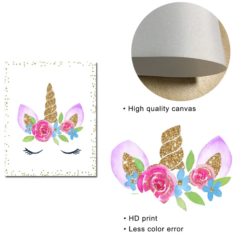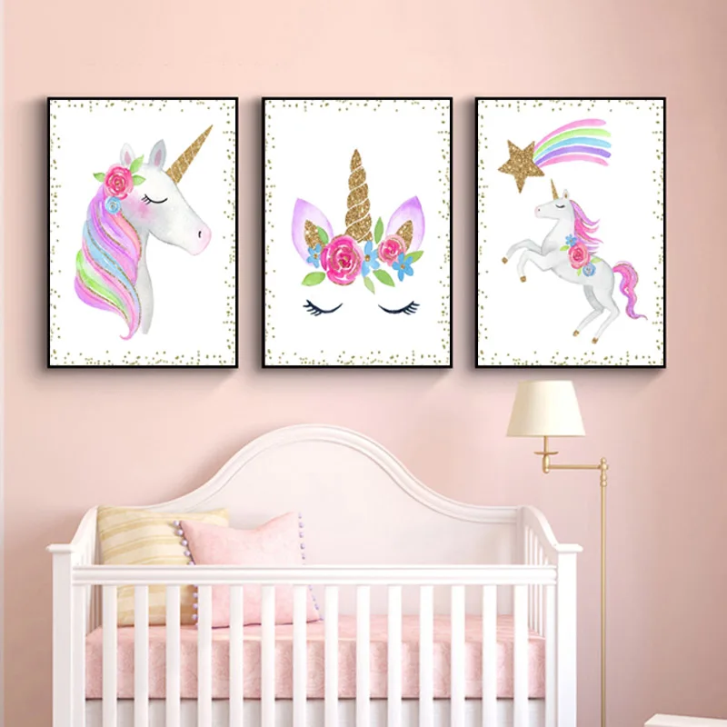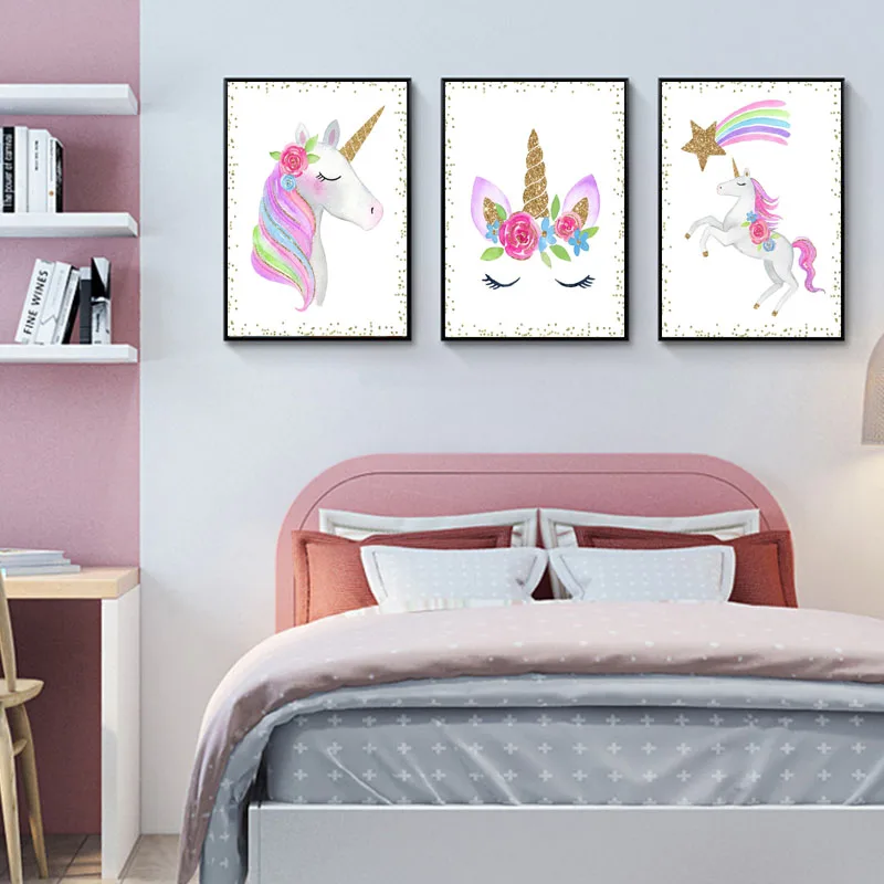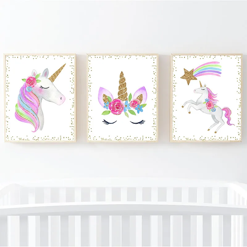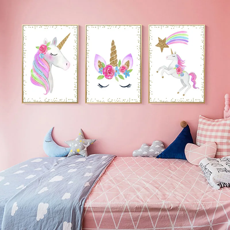 Мультяшный единорог, Детская настенная живопись на холсте, скандинавские постеры и принты, блестящие золотые настенные картины, декор для спальни для девочек