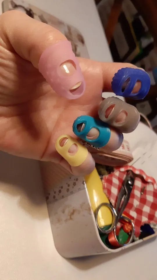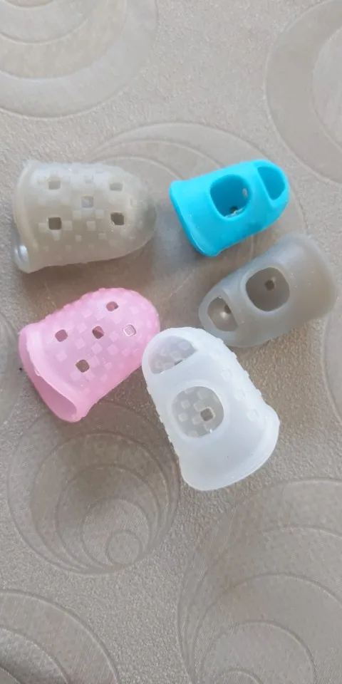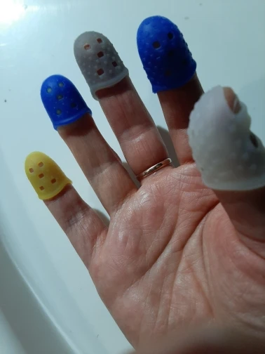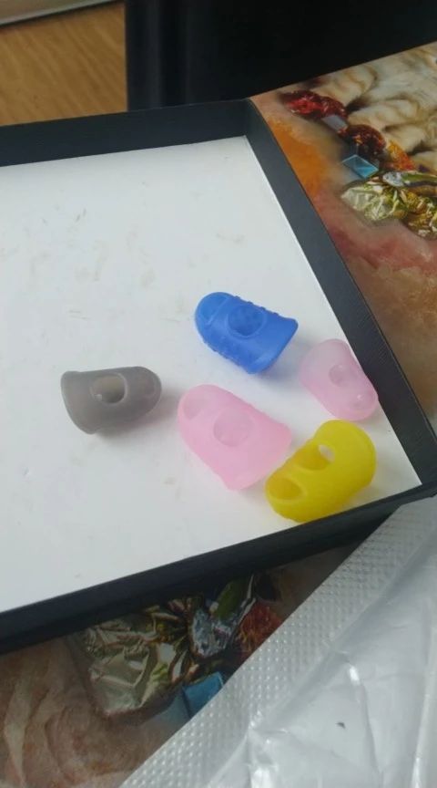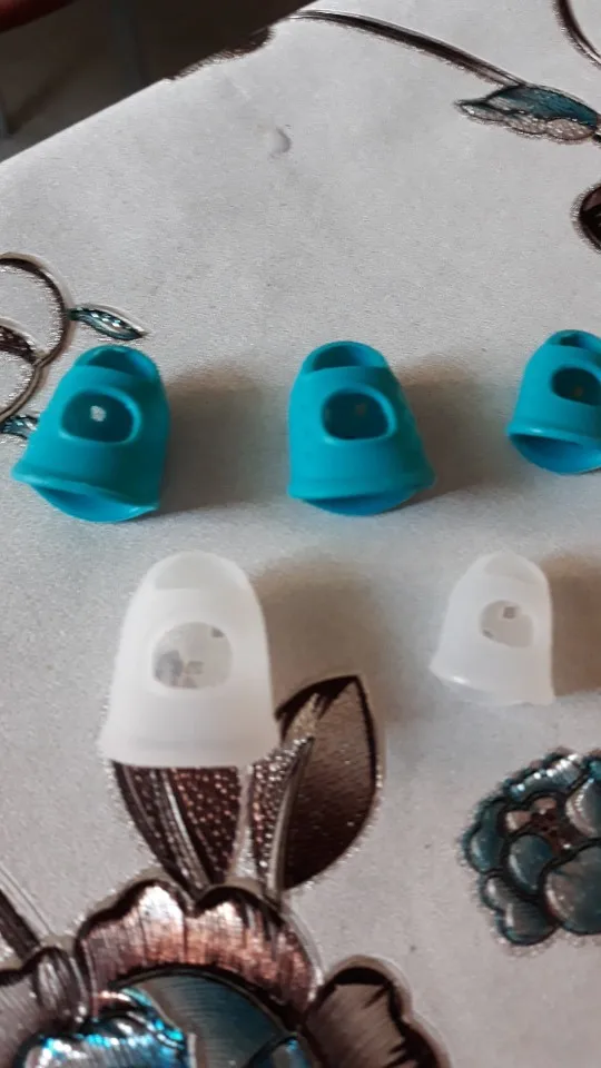 Not all of them fit my fingers sizes. 2 out of 5 either too big too small and I tried in each finger. Still 3 out of 5 fit perfectly and that's good. Три из пяти наперстка седи идеально. Ещё два забольшие для всех пальцев и за маленькие для большогл пальца. Но ещё посмотрим как в работе будет. За свою цену конечно же неплохо