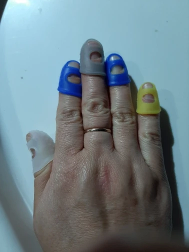 товар вроде неплохой, размеры разные, но напальчники довольно маленькие. у меня руки худенькие, но даже мне тот, что на мизинец только-только. поэтому думайте с размером внимательно. функциональность не проверяла пока, может, дополню. покупала для защиты при вязании.