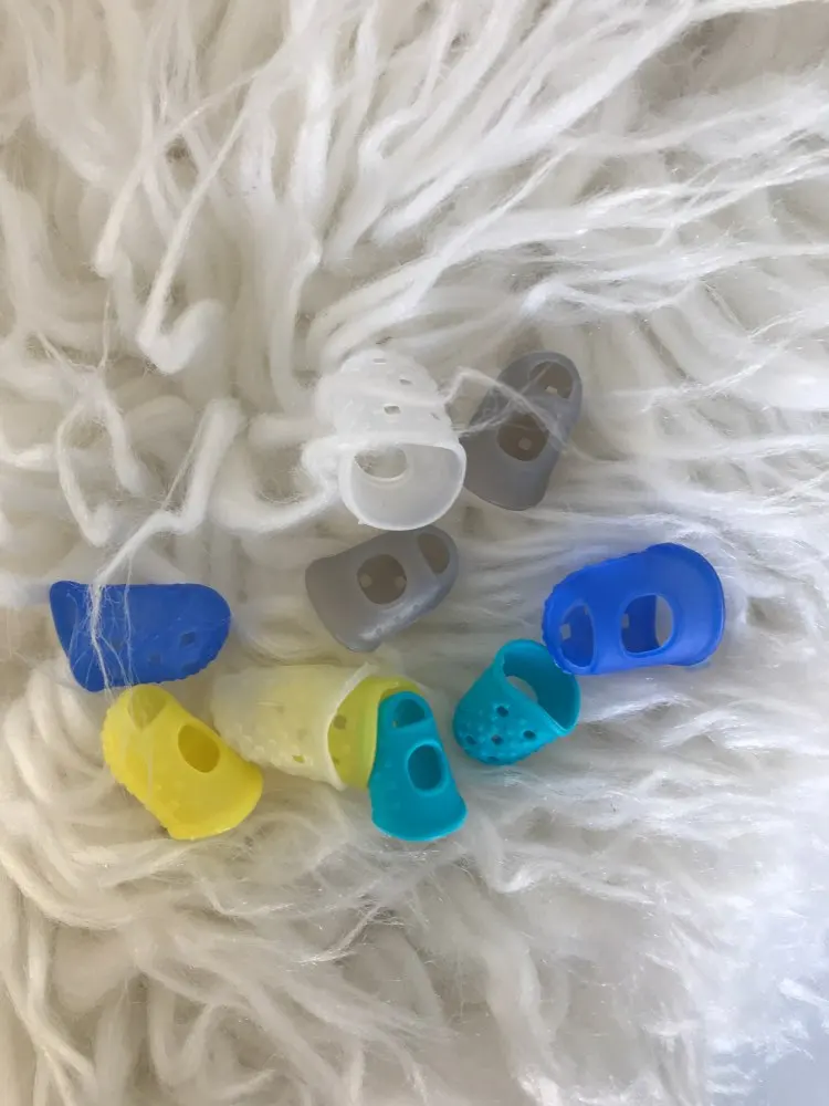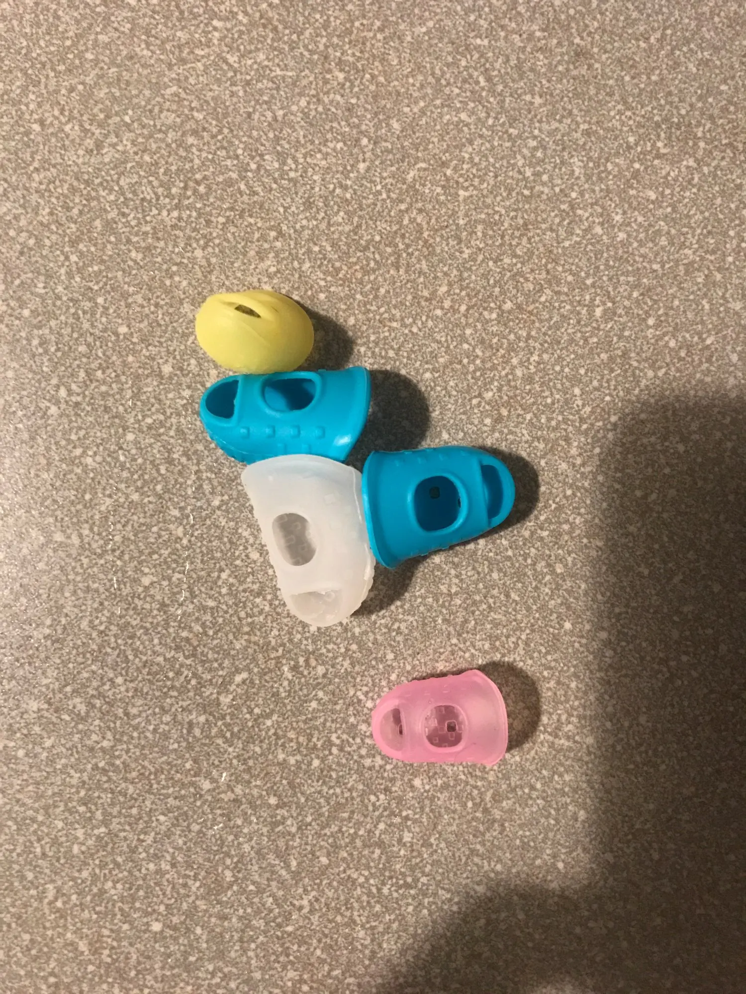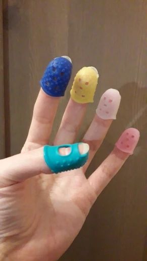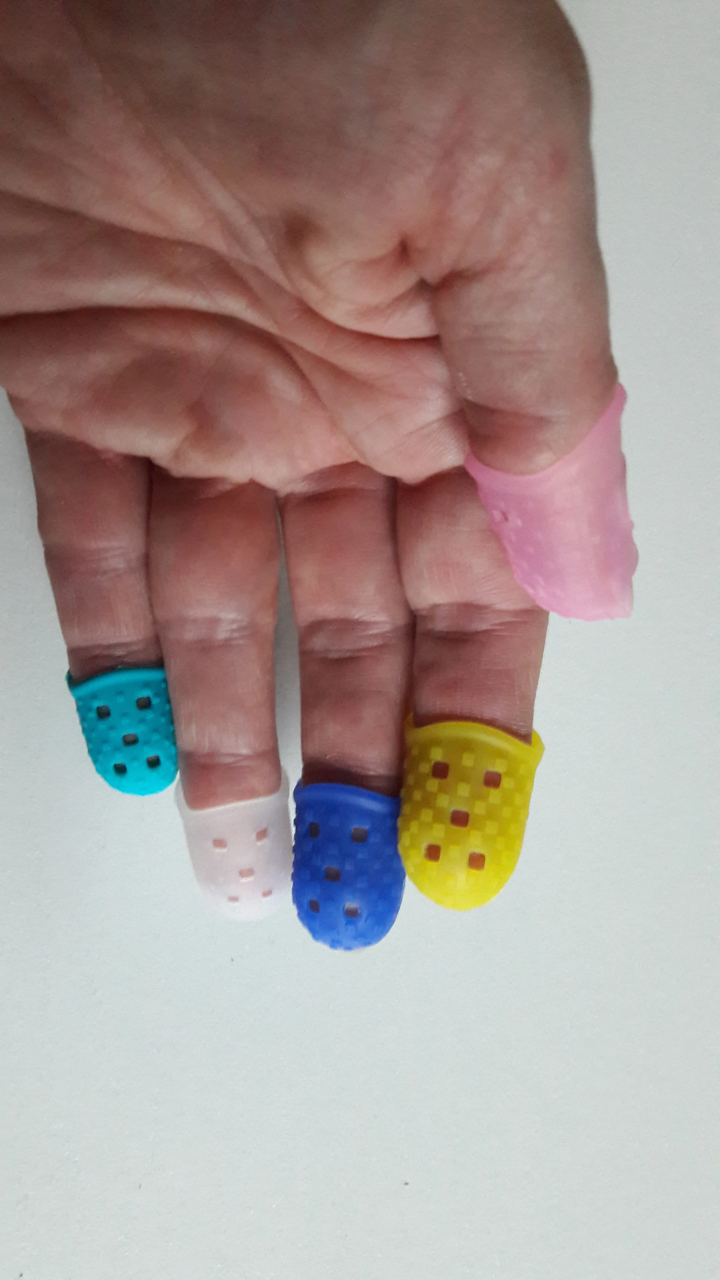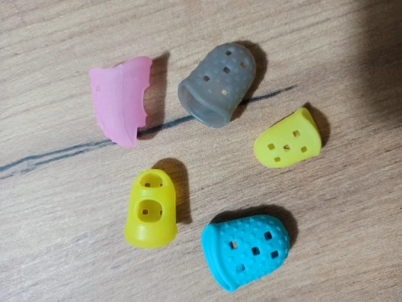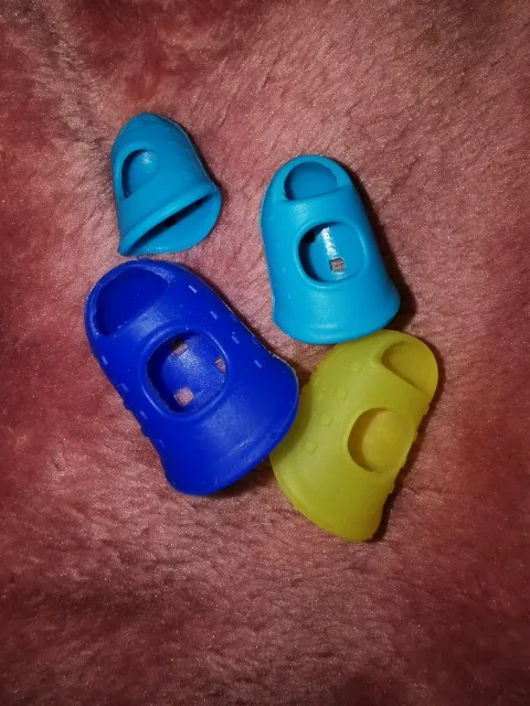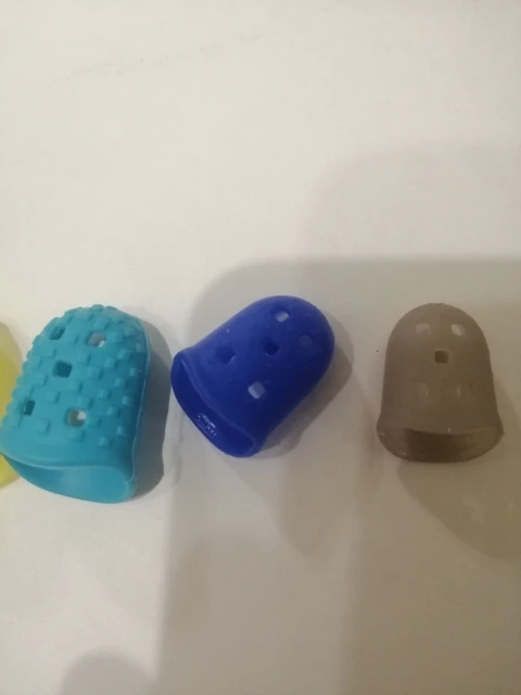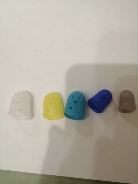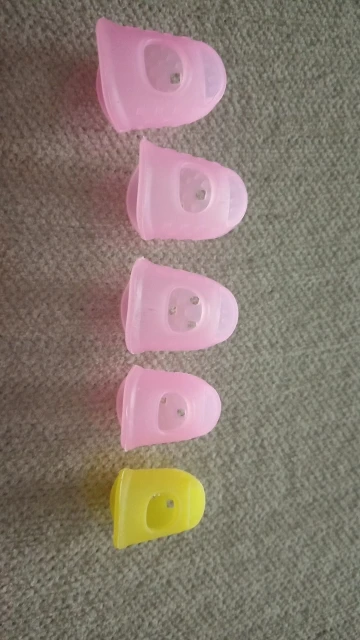 Симпатичные наперстки. Пришли двух цветов- желтые и прозрачные. 3 наперстка мне подходят, один только на мизинец, а один совсем детский. Все наперстки разного размера. на тонкую руку.