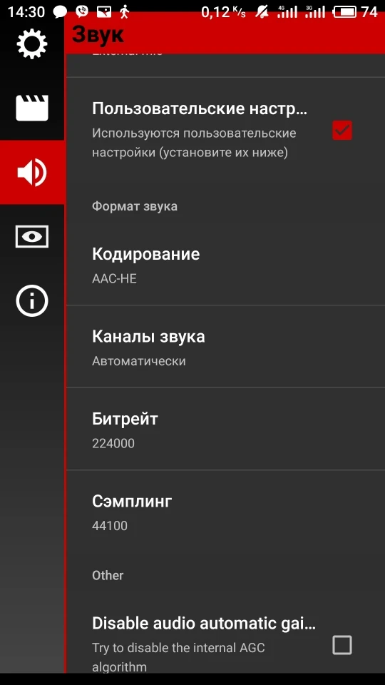 Всё хорошо. Если вы не довольны звуком, провертье само устройство. Я настраивал Cinima Fv5, выставления аудиокодека. У вас может быть и другие. Смотрите сами, какой какими возможностями обладает. У меня ААС НЕ его максимальный битрейт 256. У вас может список будет другим.