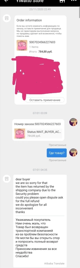 Товар не пришёл. По каким-то причинам доставка была прервана и товар вернулся к продавцу. Продавец вернул деньги.