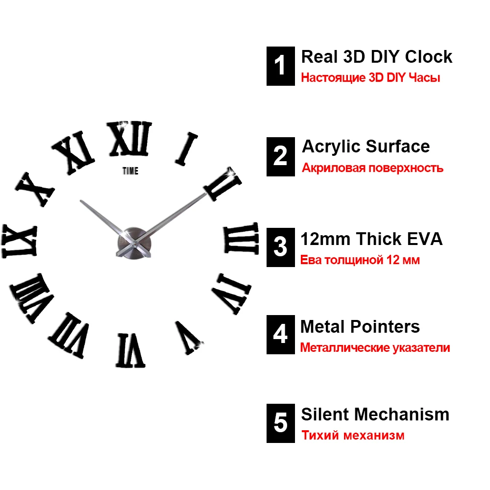 Большие настенные часы 3D сделай сам, большие кухонные часы, римские цифры, акриловые зеркальные наклейки, большие настенные часы для гостиной, домашние буквы
