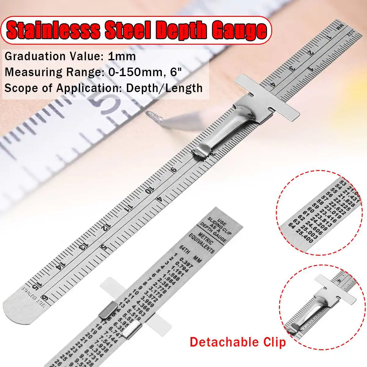 Стандартная шкала из нержавеющей стали, габаритный инструмент для измерения глубины, 0-150 мм, со съемным зажимом, удобен в использовании и переноске, 6 дюймов