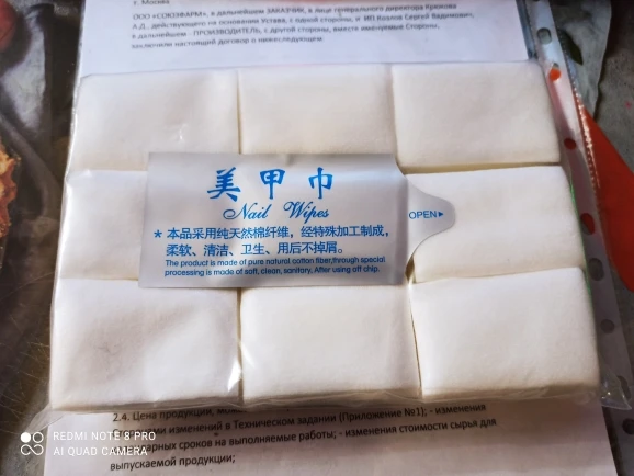Посылка пришла довольно быстро Салфетки будто с ворсом но ничего не оставляют после себя. Впитывают ацетон и обезжириватель быстро и из-за того что они плотные с них ничего не капает и не льется когда прижимаешь к ногтю чтоб стереть лак или убрать липкий слой. Обычный лак снимают быстро и хорошо и липкий слой от гель-лака тоже норм убирают. И ввидимо их немного побило пока они шли ко мне и на первой фотке видно что с ними,но это не критично(это ж салфетки,что им будет от того что они немного помялись) Еще есть маленькое отверстие из которого можно достать салфетки не разрывая пакет Клеещаяся наклейка хорошо приклеивается обратно(не отцепляется) Короче РЕКОМЕНДУЮ,все замечательно