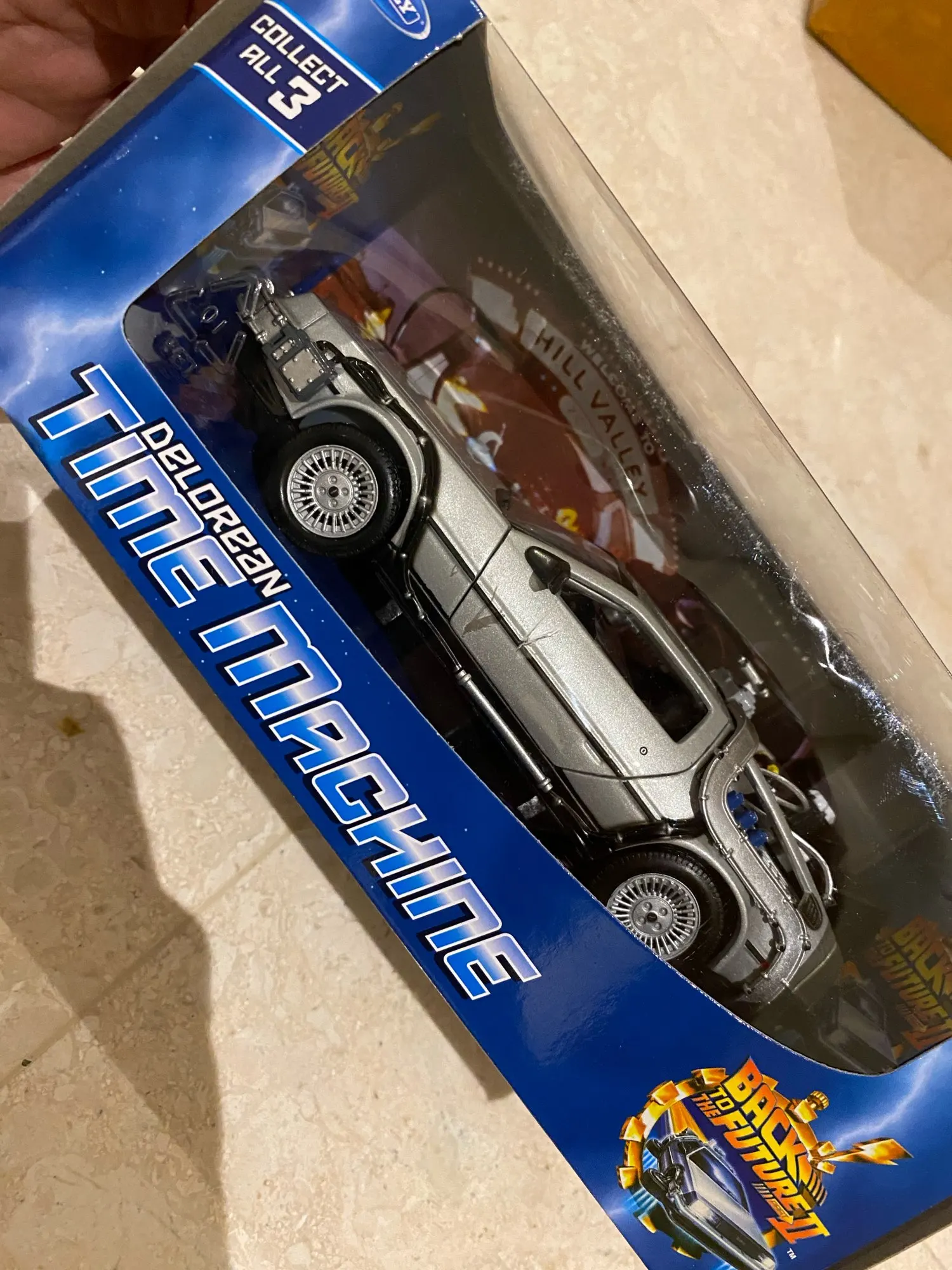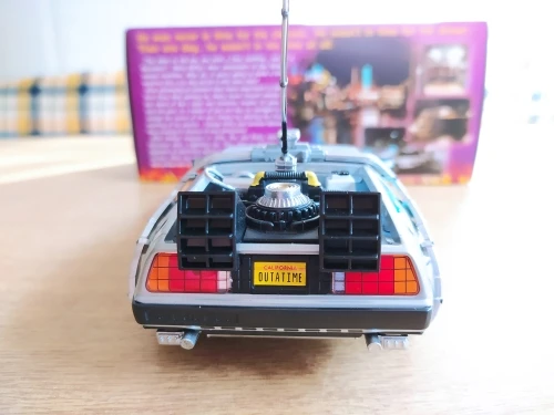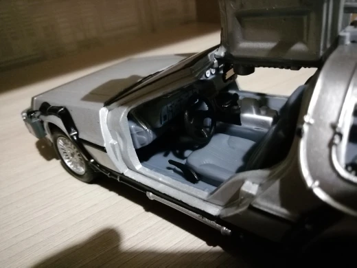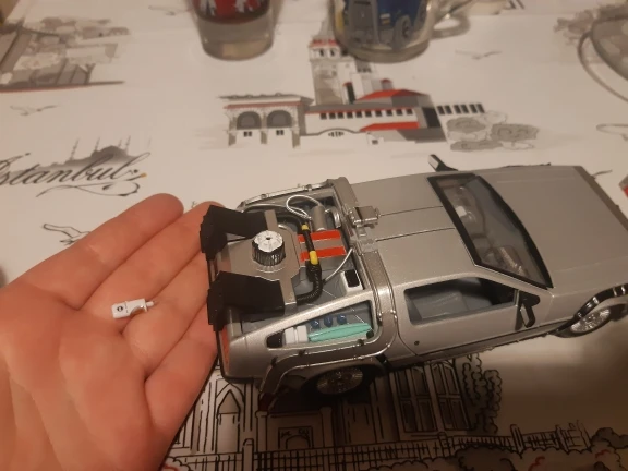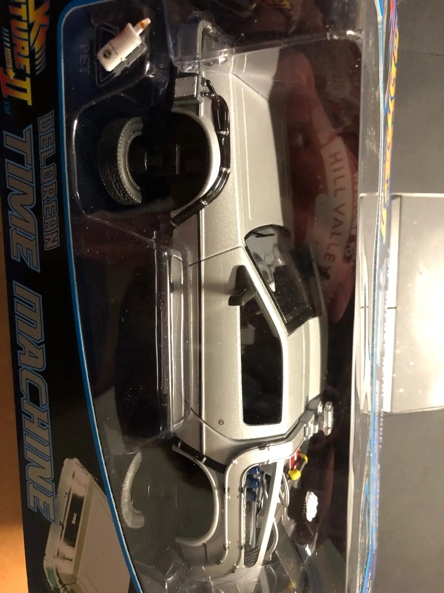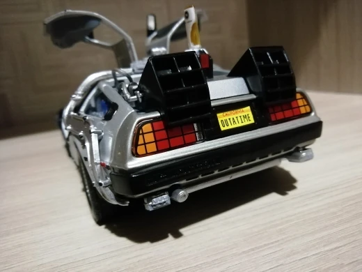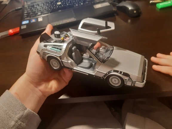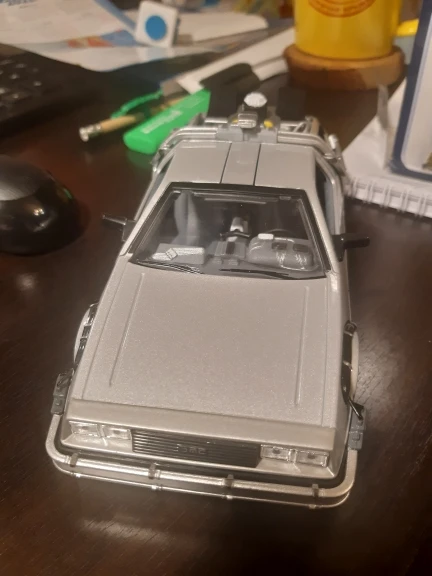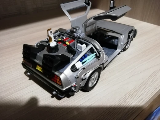 Машинка пришла без повреждений, в оригинальной упаковке. Дверки открываются,но шарнирчики довольно быстро перестали держать двери в вертикальном положении. В целом моделькой доволен, колеса крутятся, хоть и туговато. играть повседневно как игрушкой наверно не стоит, ибо все таки модель, а вот поставить на полочку можно как в простом варианте, так и в варианте когда колеса переведены для режима полета. На фотографии не установлена деталька mr. fusion она есть в комплекте, просто отдельно в упаковке закреплена.