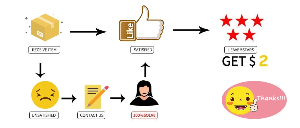 1. Если вы удовлетворены нашими продуктами и услугами, пожалуйста, оставьте положительотзывы в 5 звезд и 5 звезд для подробной оценки вашего заказа. Мы разумеется предоставим положительный отзыв.2. Если вы недовольны ими, пожалуйста, свяжитесь с нами, прежде чем оставить отрицательный отзывы в. Мы гарантируем 100 % разрешение любой вашей проблемы.
