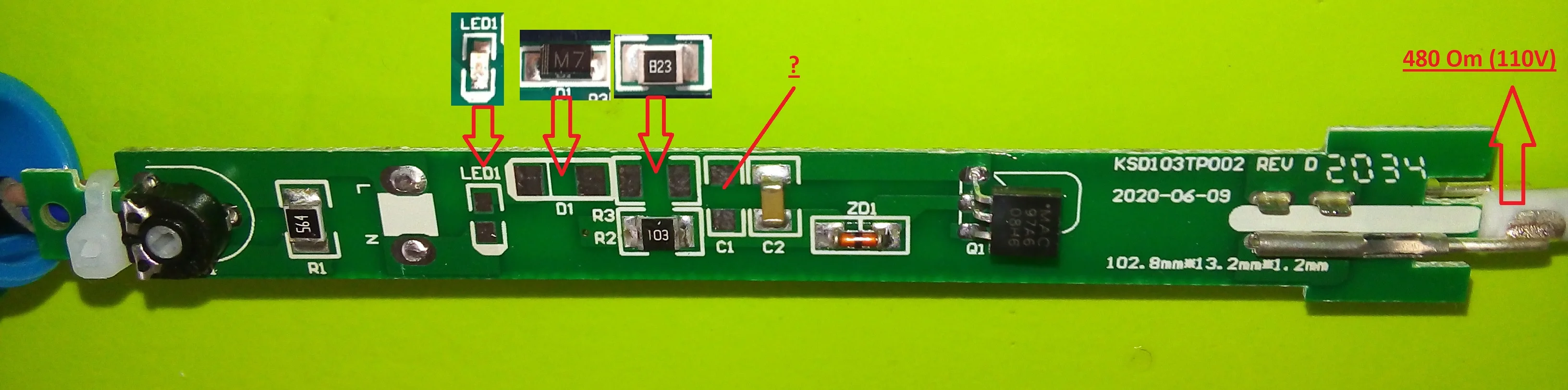 Паяльник пришёл нерабочий. После вскрытия оного выяснилось: 1- Отсутствие компонентов на плате: нет диода М7 - 1А 1000В, нет светодиода LED, нет резистора - 82 кОм (823), а также конденсатора (ёмкость которого я не нашёл в сети). 2- Нагревательный элемент имеет сопротивление 480 Om и по простой формуле вычисляется- что он рассчитан на 110V (для американского рынка) и никак не на 220V !!!, а значит в короткий срок он просто сгорит, выдавая запредельную температуру. 3- А также выгорит и жало (не рассчитанное на такие температуры). В итоге:- помимо поиска причины неисправности необходимо дополнительно искать и впаивать туда недостающие компоненты, но и увеличивать сопротивление резистора R2 (менять его на сопротивление 56 kOm или большее) чтобы компенсировать рассчитанную мощность. Если вам это надо, то можете покупать этот конструктор с недостающими деталями, а я лично- разочарован в этом изделии!!!