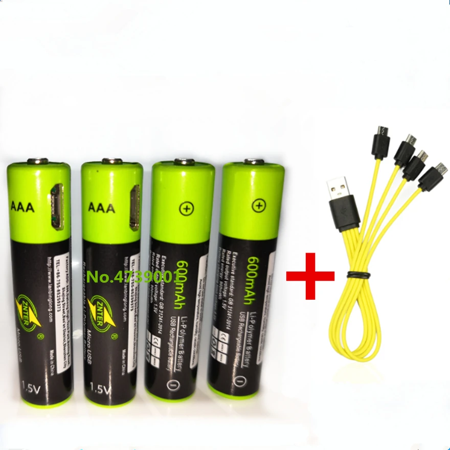 Аккумулятор ZNTER, 4 шт., 1,5 в, AAA, 600 мА ч, USB литиевая полимерная аккумуляторная батарея, с кабелем Micro USB