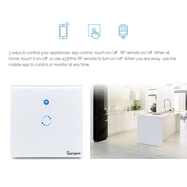 Беспроводной настенный выключатель может быть добавлен в приложение iOS/Android eWeLink через WiFi, что позволяет пользователям удаленно включать/выключать подключенные огни или приборы отдельно от любого места в любое время. После успешного обучения кодам с дистанционным управлением 433 МГц, сенсорный светильник можно включить/выключить в помещении.
