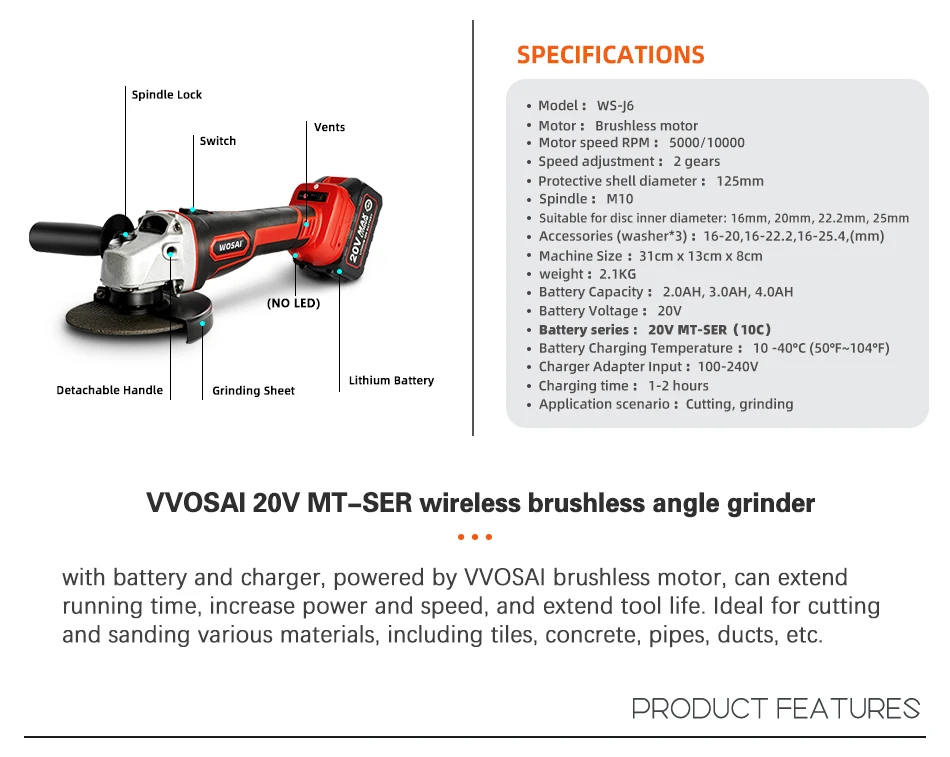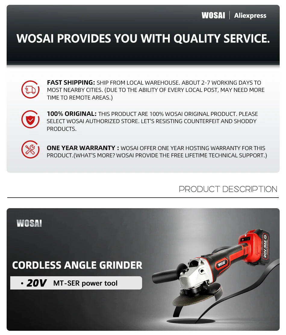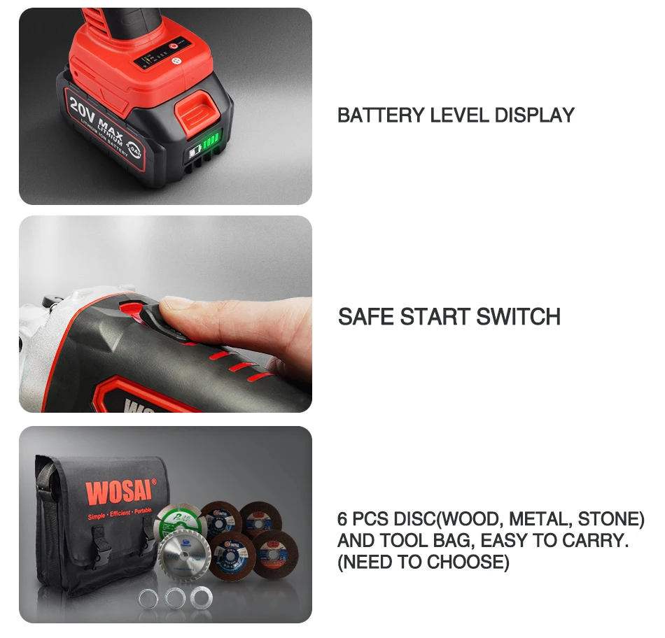 Угловая шлифовальная машина WOSAI, 20 в, бесколлекторная, литий-ионный