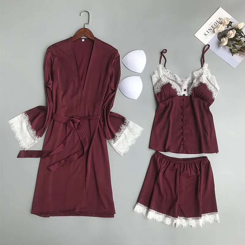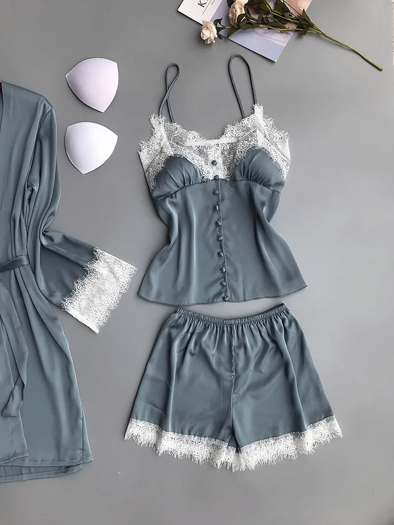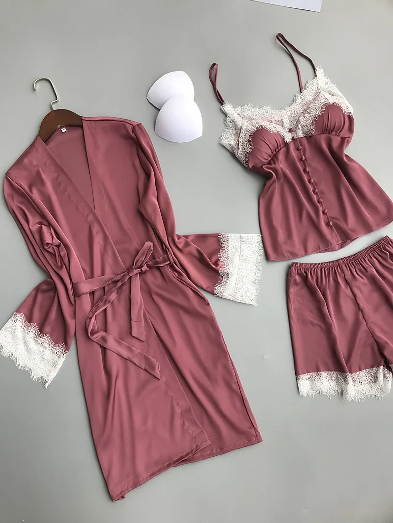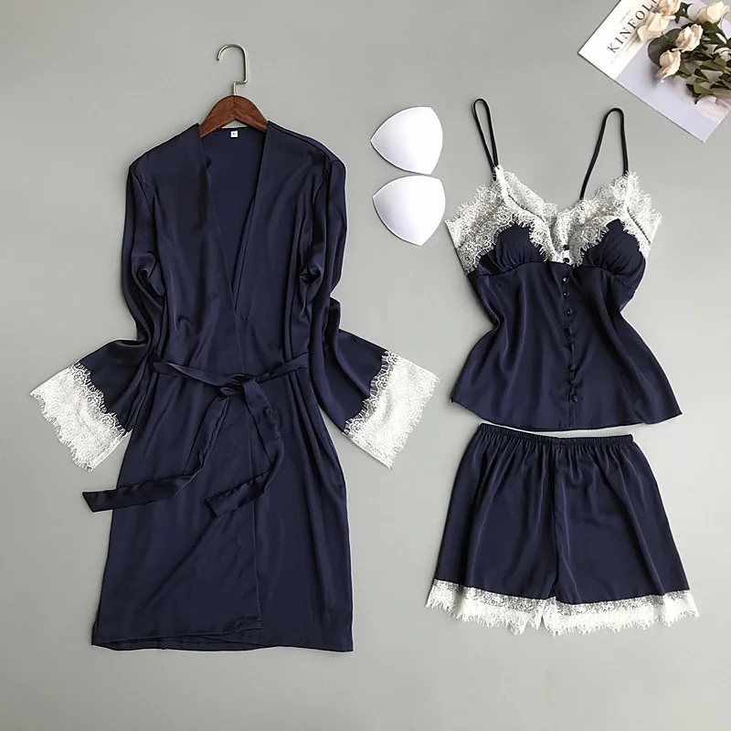 Lisacmvpnelкомплект из 3 предметов: шелковый халат со льдом, кружевной сексуальный банный халат на тонких бретельках с нагрудным подкладом, ночная рубашка + халат + шорты, Пижама для женщин