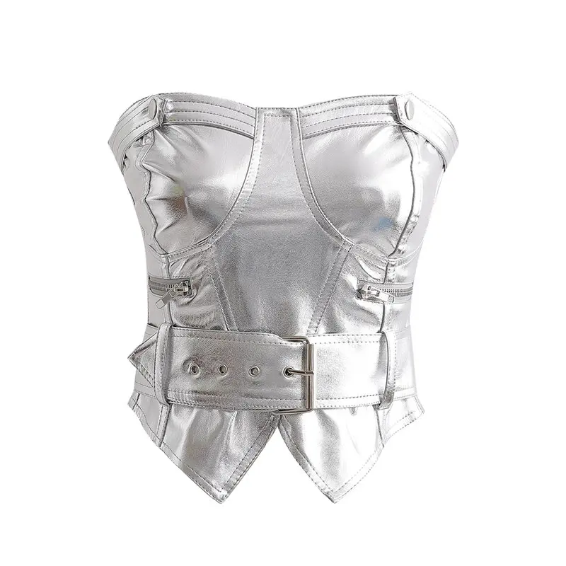 Женский укороченный Топ без бретелек, черный, из искусственной кожи, на молнии, с поясом, 2019