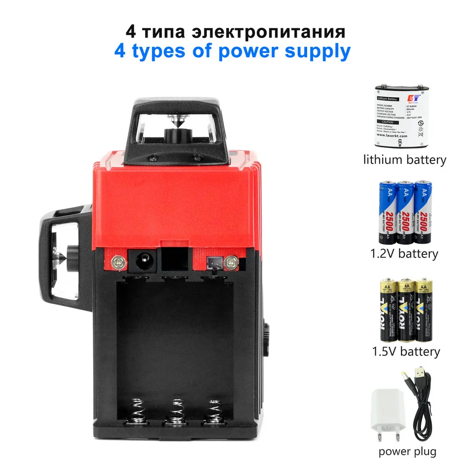 О KaiTian 3D лазерный уровень 360 Nivel лазерПараметрыЛазерный уровень 3D5 имеет три лазерных окна, каждое окно может запускать 4 лазерных линии, всего 12 лазерных линий (8 вертикальных линий, 4 горизонтальных линии, 4 лазерных линии объединяются в плоскость).-Длина волны: 650 нм <1 мВт-Класс лазера: II-Тип демпфирования: магнитный-Продолжительность выравнивания: <= 4s-Лазерный уровень линия Ширина на 10 м: 3,5 мм-Горизонтальная, вертикальная точность: +- 2 мм @ 10 м-Оротропная точность: 90 градусов +- 30"-Диапазон выравнивания: +- 4 (степень)-Время работы:2 ~ 3 ч/3,7 v/800mah батарея x1pcs.В общем, может быть полная зарядка аккумулятора 1 час.-Рабочая температура: от-10 до + 50 (по Цельсию)-Температура хранения: от-20 до + 60 (по Цельсию)4 типа источника питания3,7 V 800mAh перезаряжаемая литиевая батарея x 1 шт,1,5 V AA аккумулятор и зарядное устройство1,2 V AA аккумулятор и зарядное устройствоАдаптер переменного тока 100-240 ВKaitian зеленый лазерный уровень 12 линий Область применения:Улучшение дома, обнаружение и расположение, плоты и подъемы, а также все другие внутренние и внешние (с дополнительным приемником или детектором) конструкции и планировки.Красный лазерный уровень 12 линий Упаковочный лист:Выберите другой размер изделия lazer в цвете.
