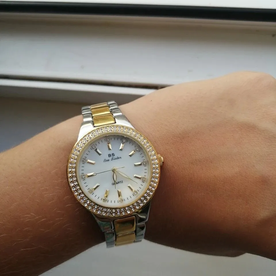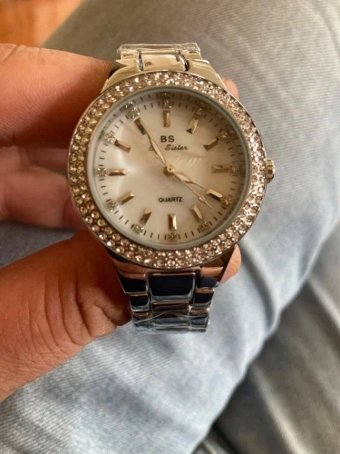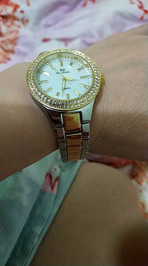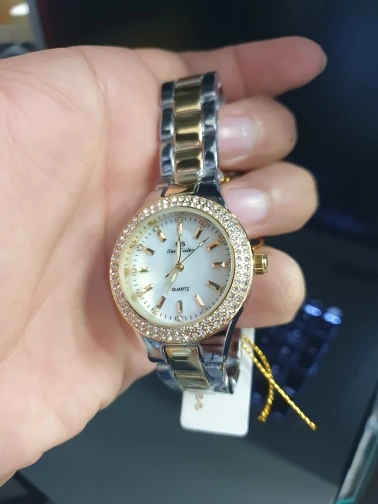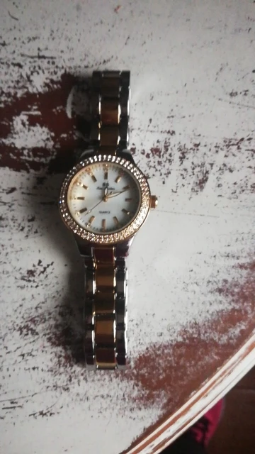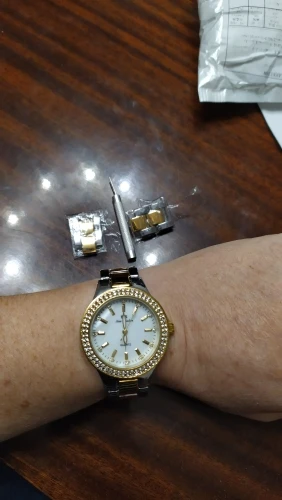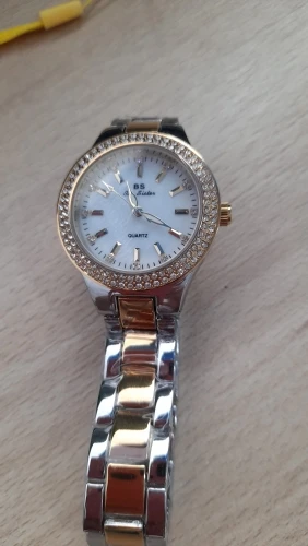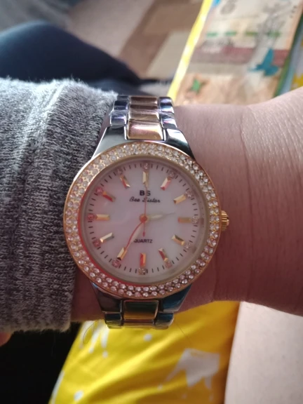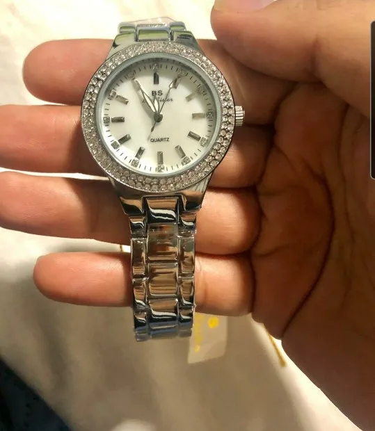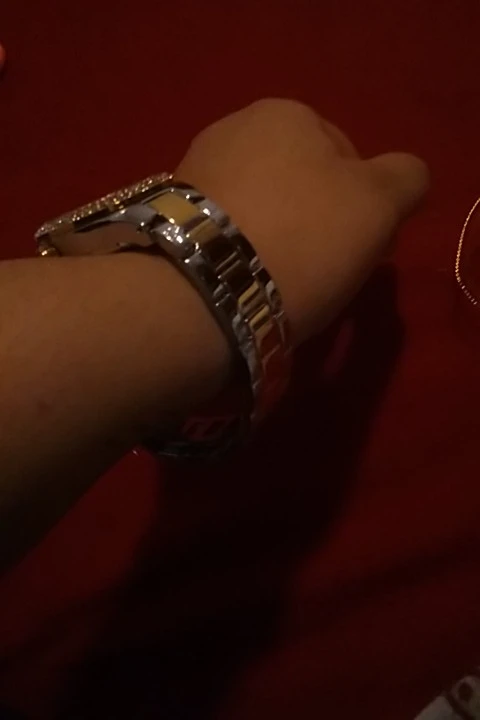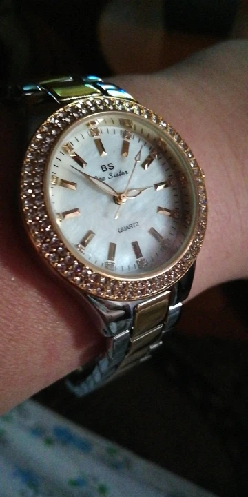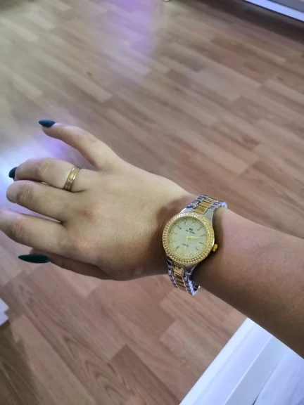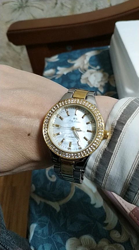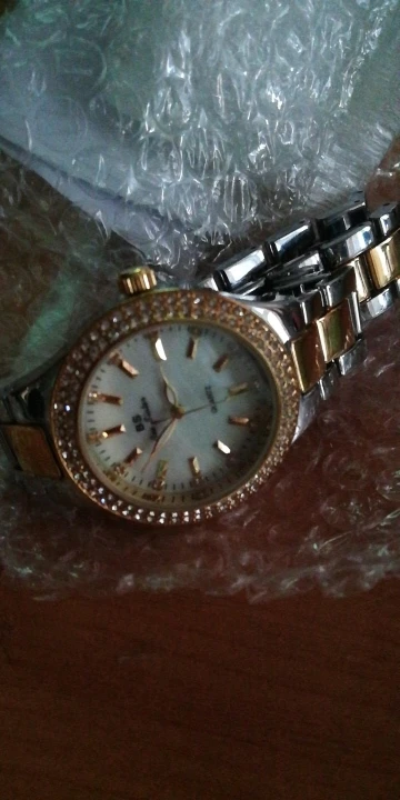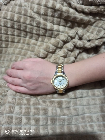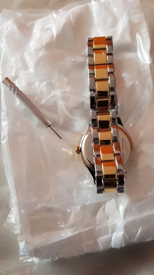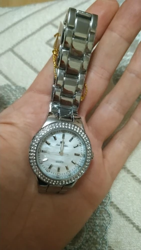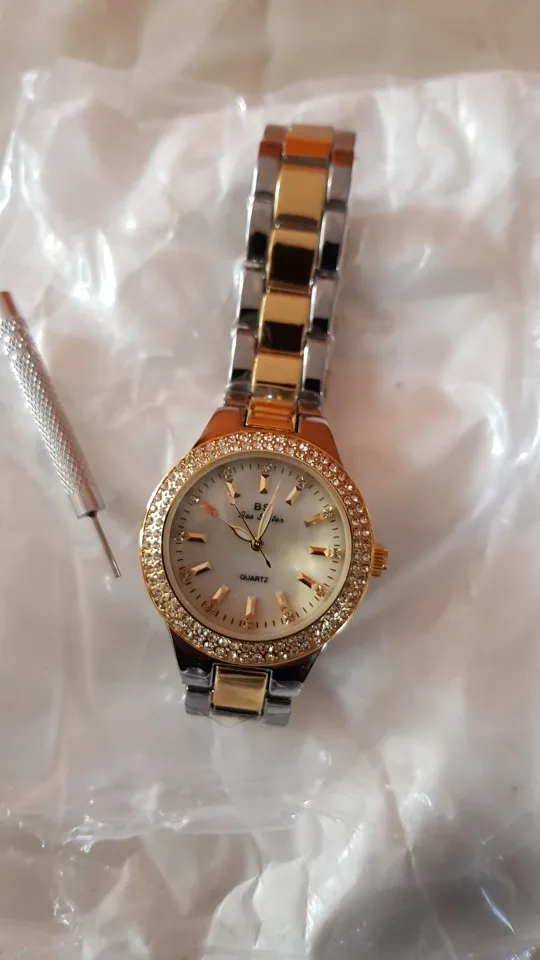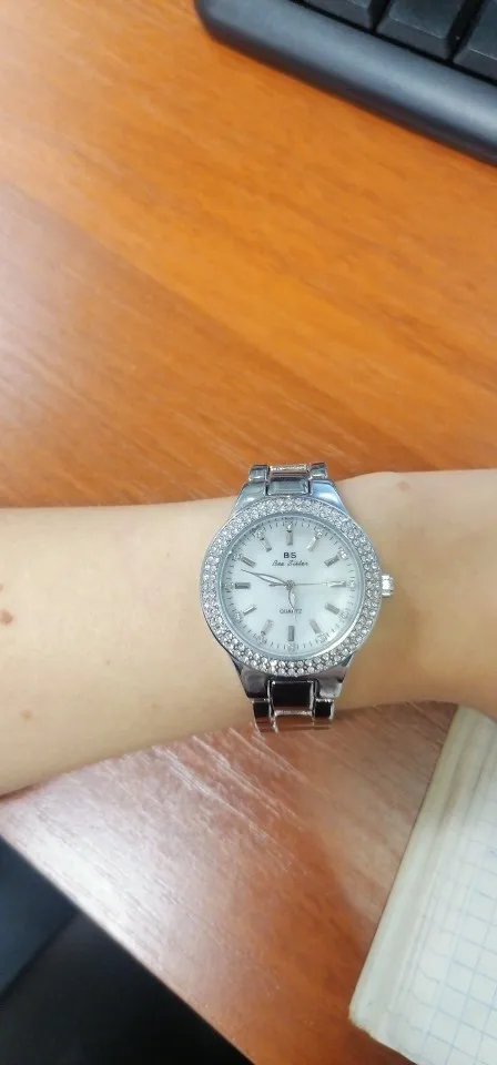 Доставка быстрая, 2 недели в Самару. Упаковано в уплотнитель и пупырку, для такой стоимость хотя бы в коробку положили. Часы выглядят очень красиво, тяжелые, царапин не обнаружено. Браслет был в пленке, а вот циферблат нет, стразы все на месте. Часы были без ограничителя на колесике перевода стрелок, т. е. пришли работающие тикающие, это очень странно, даже в дешманских часах до 200р. ставят ограничитель. Застежка очень и очень тугая, браслет пришел закрытым, пришлось потрудиься, чтоб открыть, после нескольких раз стало помягче, но всё равно туго. В комплекте шнурок, вопрос куда его пристегнуть риторический, при вскрытии пакета случайно его разрезала, это опять минус упаковки. И ещё шпилька для уменьшения браслета, очень плохого качества, сразу погнулась на первой же скрепки, в итоге проколола два пальца пока снимала лишние звенья. Итог - часами довольна, по цене вышли 729р на распродаже 11.11., повседневно носить не буду, чтоб подольше не облезли. Рекомендую, на руке смотрятся отличн