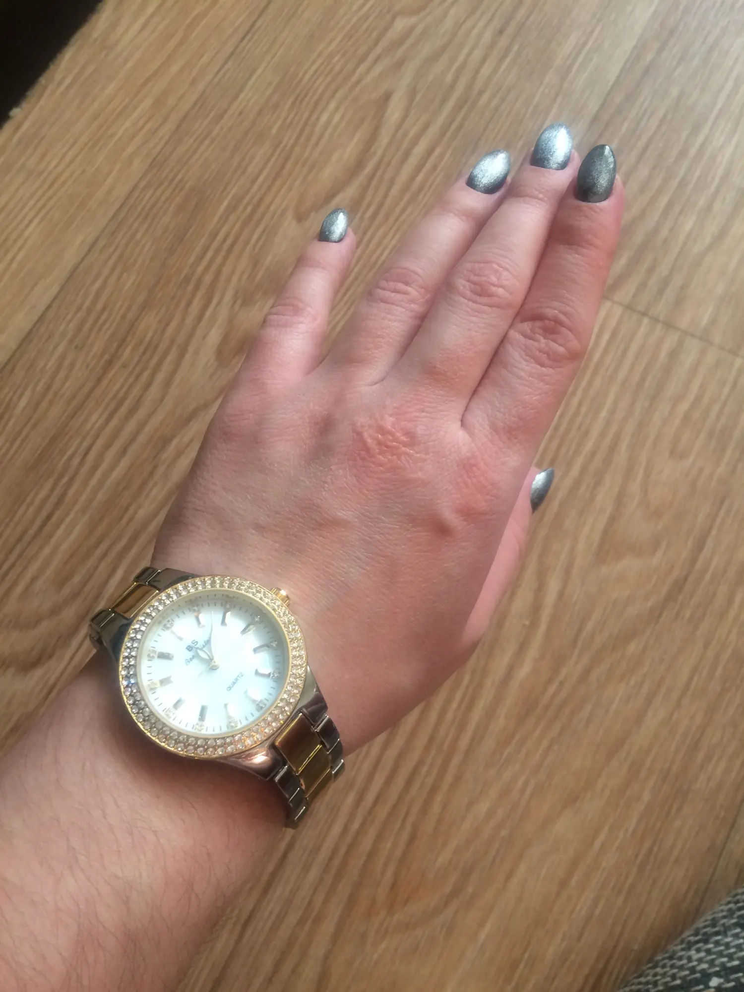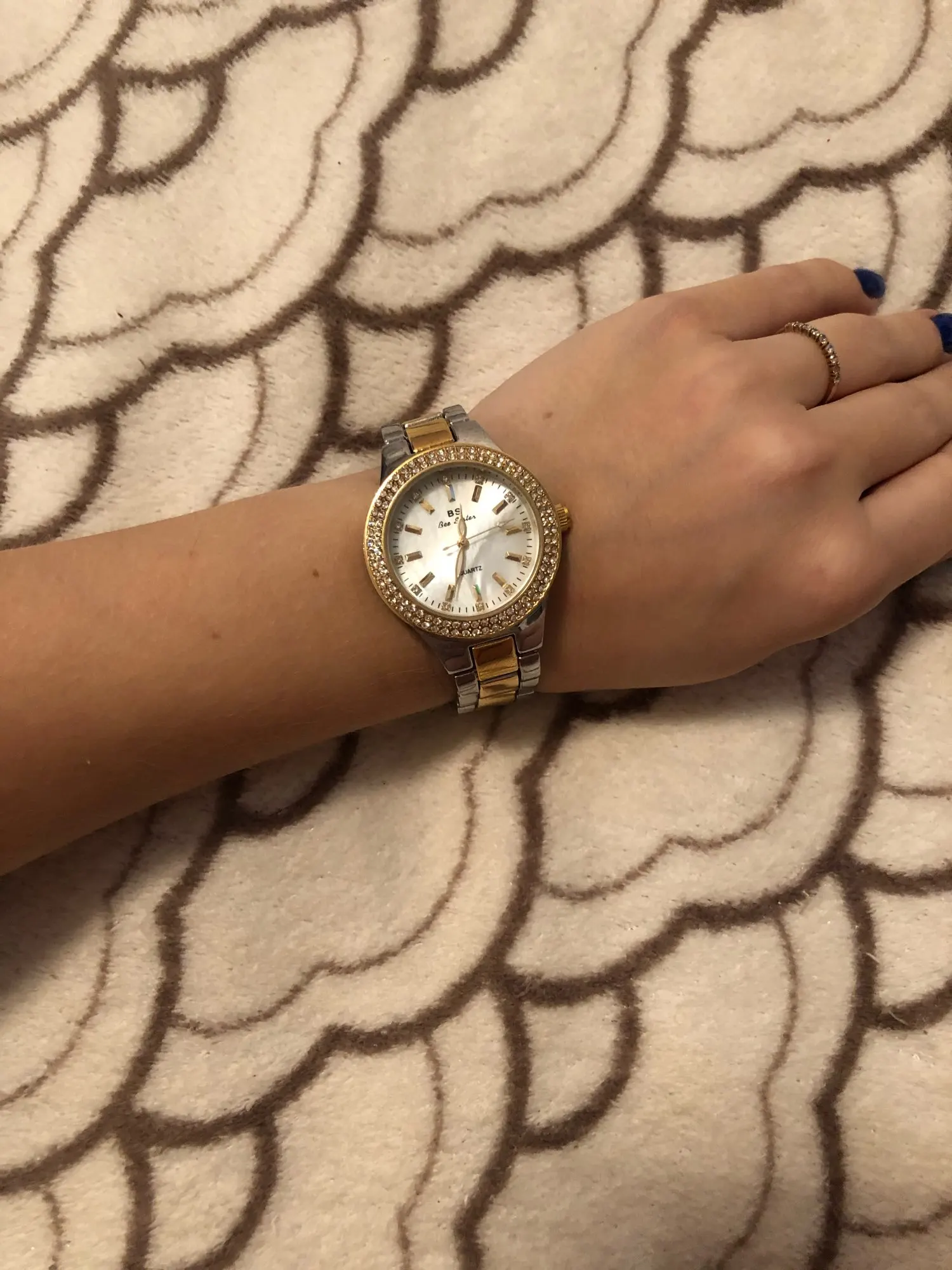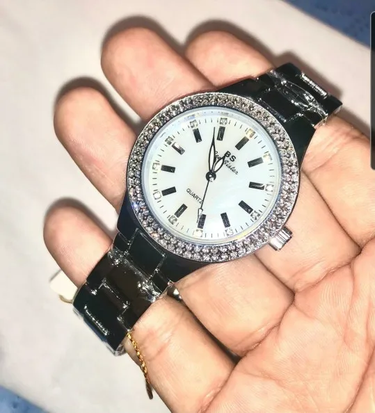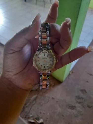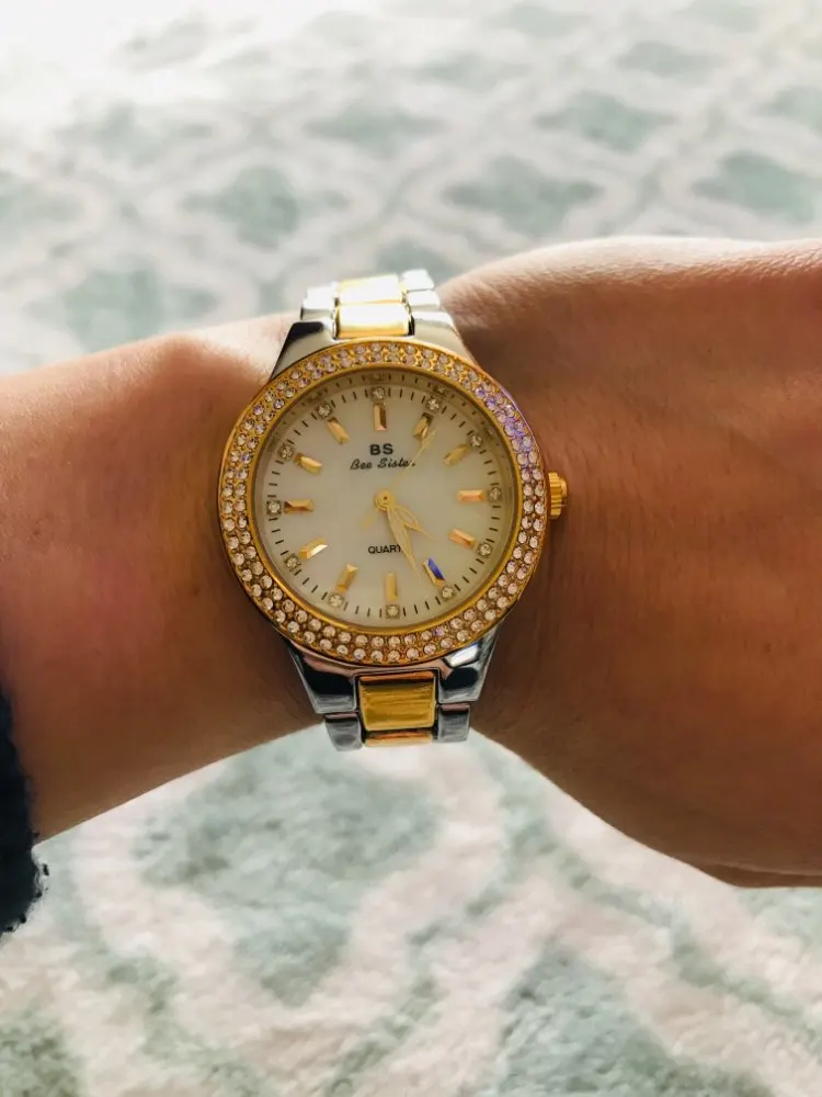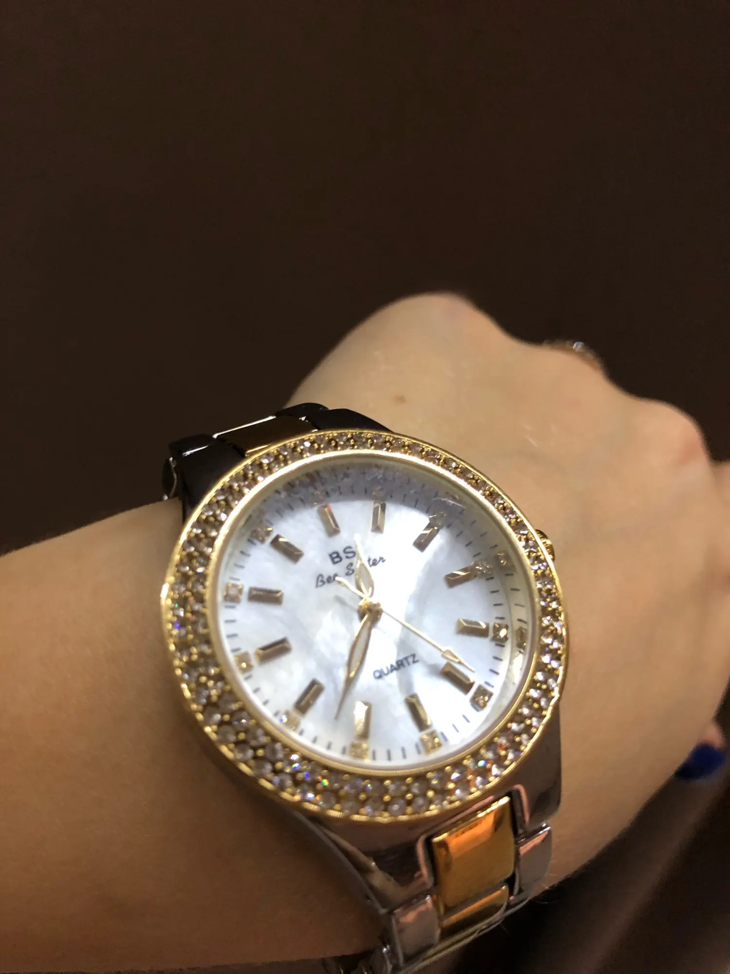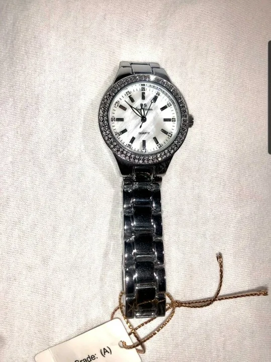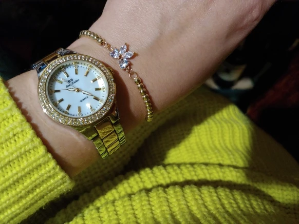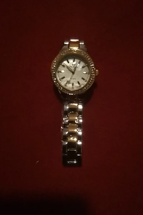 Доставка быстрая, 2 недели в Самару. Упаковано в уплотнитель и пупырку, для такой стоимость хотя бы в коробку положили. Часы выглядят очень красиво, тяжелые, царапин не обнаружено. Браслет был в пленке, а вот циферблат нет, стразы все на месте. Часы были без ограничителя на колесике перевода стрелок, т. е. пришли работающие тикающие, это очень странно, даже в дешманских часах до 200р. ставят ограничитель. Застежка очень и очень тугая, браслет пришел закрытым, пришлось потрудиься, чтоб открыть, после нескольких раз стало помягче, но всё равно туго. В комплекте шнурок, вопрос куда его пристегнуть риторический, при вскрытии пакета случайно его разрезала, это опять минус упаковки. И ещё шпилька для уменьшения браслета, очень плохого качества, сразу погнулась на первой же скрепки, в итоге проколола два пальца пока снимала лишние звенья. Итог - часами довольна, по цене вышли 729р на распродаже 11.11., повседневно носить не буду, чтоб подольше не облезли. Рекомендую, на руке смотрятся отличн