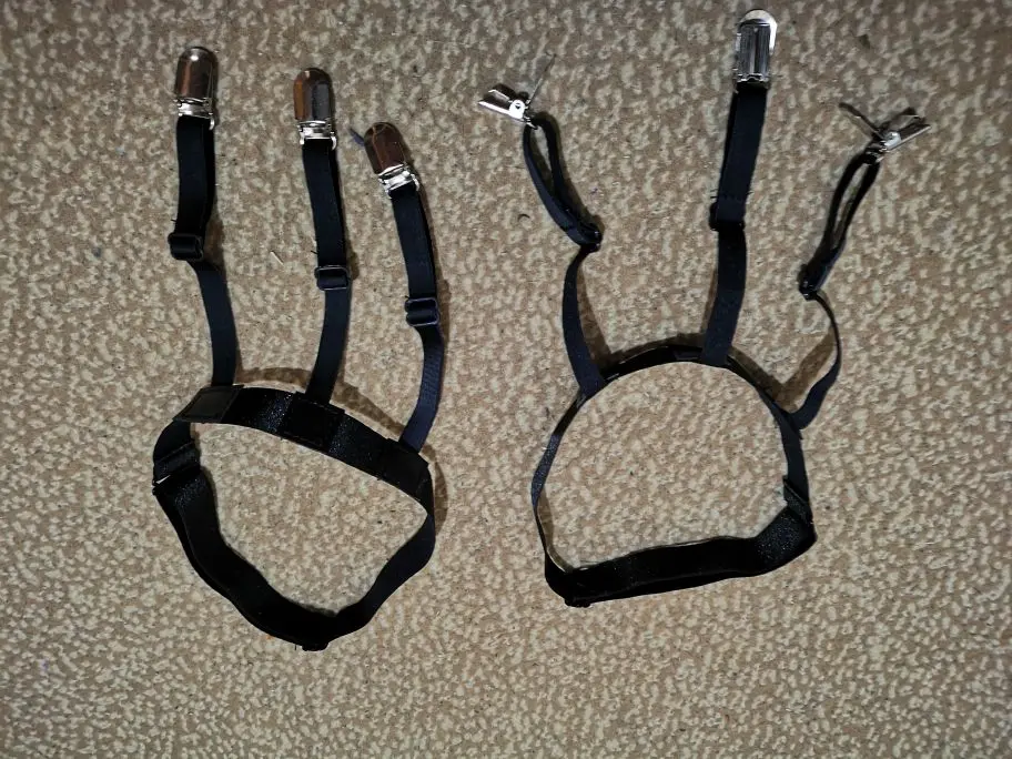 Металлические пряжки держат рубашку плохо, цепляются только за край рубашки, где есть утолщение. Можно подгибать край несколько раз, чтобы лучше цеплялось, в целом надо привыкать и подбирать длинну, чтобы ноги не натирало и не давило
