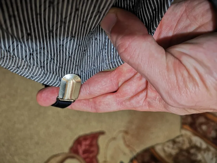 Цепляется за край рубашки, не в любом месте. Но уменьшив длину шнурков держит хорошо. В целом очень хорошие подтяжки. Брал без металлических прищепок у другого продавца, они постоянно отцеплялись от рубашки.